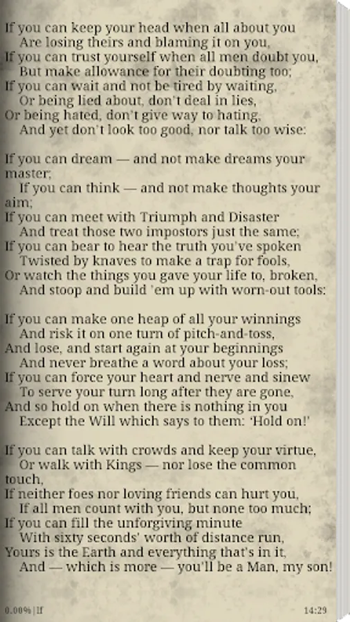 "If ..." (English If-;. Russian name translation by S. Marshak) - one of the most famous poems by Rudyard Kipling, written in 1895 and published in 1910 in the book "Rewards and Fairies» (Rewards and Fairies), cycle of tales and poems of Kipling, where it accompanies the story "Brother square shoes» (Brother square-Toes). It is considered a classic poetic expression of stoicism of the Victorian era. According to a survey conducted by the BBC BBC in 1995, it was named the most popular English poem. Original and 6 translations of authors: M. Lozinsky, F. Iskander, S. Marshak, V. Kornilov, AV Gribanov, AV Sharapova. Plus Recitation by Sir Michael Caine in the menu in the book section.