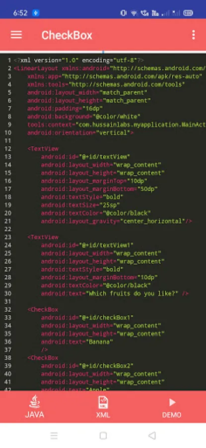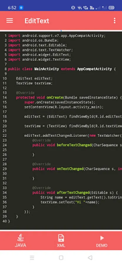 The app consists of tutorials, code examples, demo, and theoretical explanations. You can learn basic concepts of android app development, beginner level android development concepts and examples with code and demo, advance level android features with code and demo, professional android app codes with explanation and helpful info segments with important information about becoming a professional android developer and knowledge about different important things related to Android App Development. Further we have given 9 professional apps fully developed with advance android development coding techniques which you can buy and enhance your skills further.