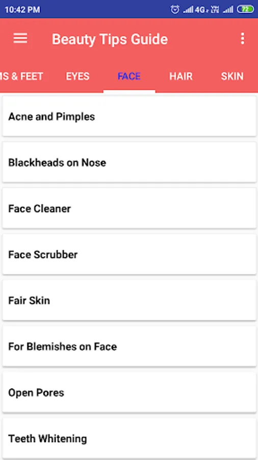 Homemade Beauty Tips App contains Natural beauty tips which can be easily prepaid at home. This app includes a number of Natural Ayurvedic remedies for Beauty related problems of Face, Hair, Eye, Skin, Arms and Feet. It is given as five categories