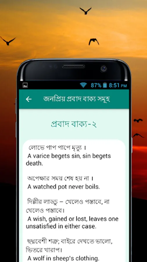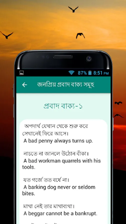 This app contains the list of all kind of Bangla Probad Bakko and proverb with its English translation. It will be very convenient for the students as well as for all kinds of people. The job seeker can also have this to read frequently. Here are some of the most popular Bengali proverbs which explain the sentences. They are used as a kind of talk. These proverbs are coming from the mouth of the Bengali people. This proverb is the most important section of Bengali literature and Bengali grammar.