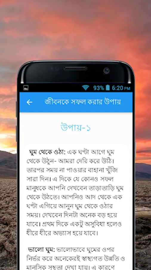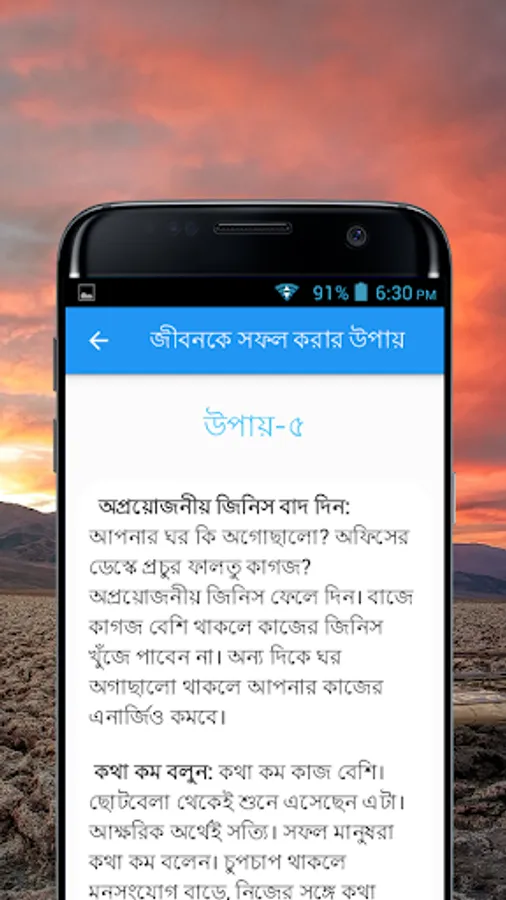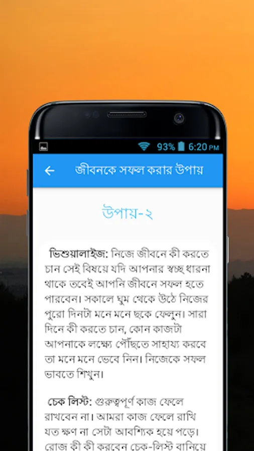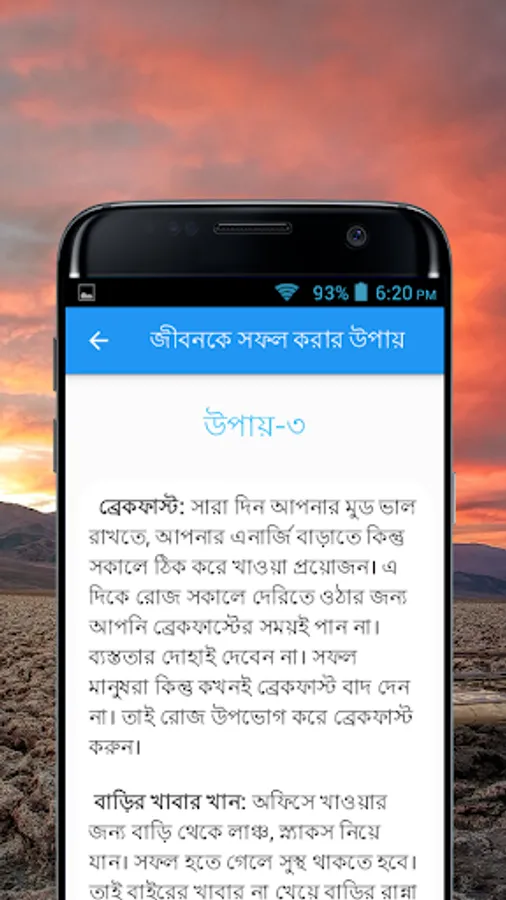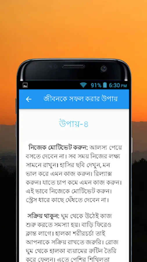 This app is for ways to make life successful. This app has lot of guideline about how to success life. This apps you can know about - Meditation, Work on physical gesture, eat low-sugar foods, Sufficient sleeping, Exercise the body, Be one of the attention at a time, practice to be attentive, Talking with yourself, Looking for inspiration, Divide the way to achieve the goal.