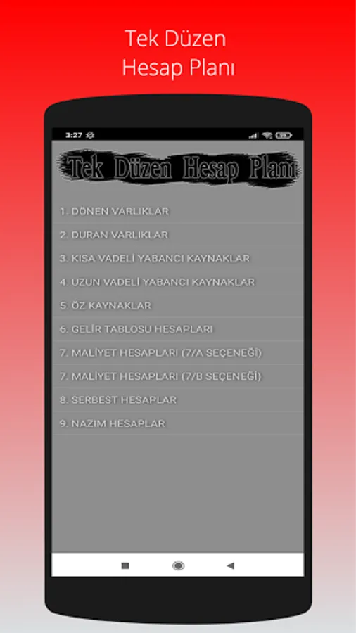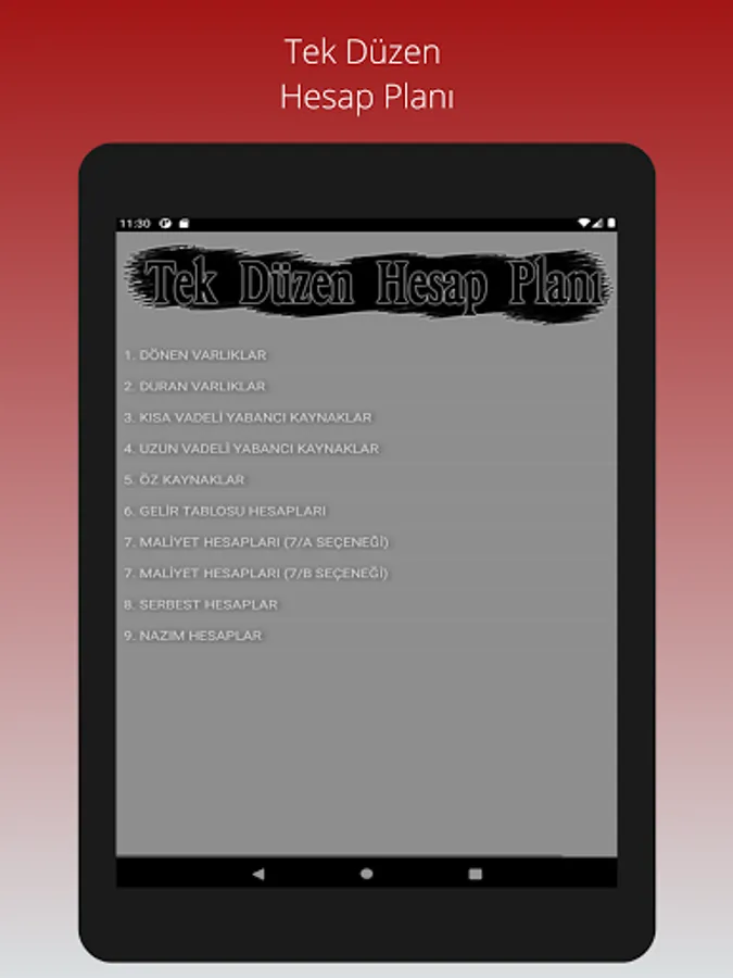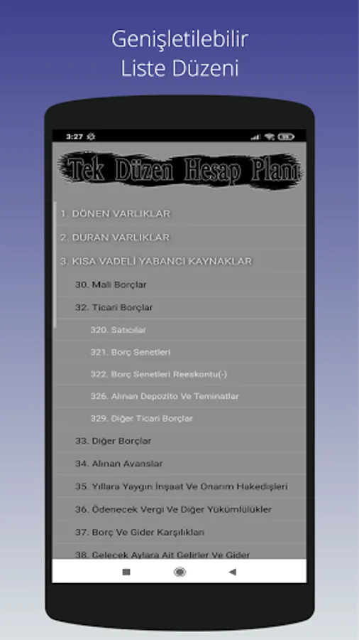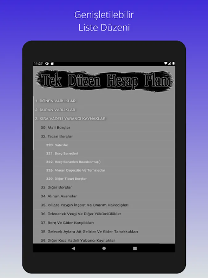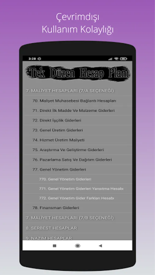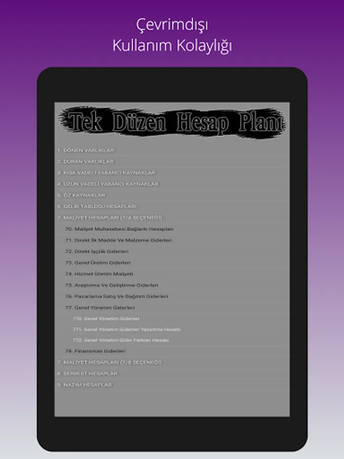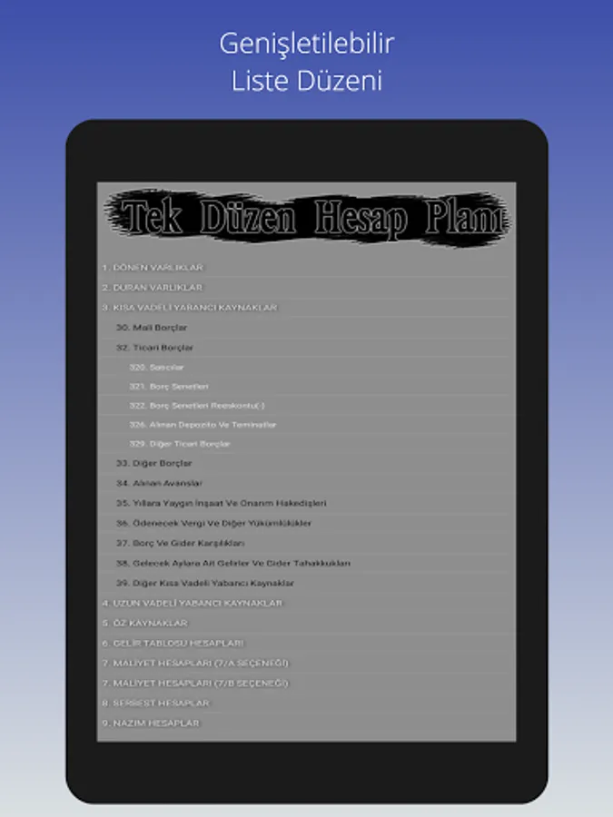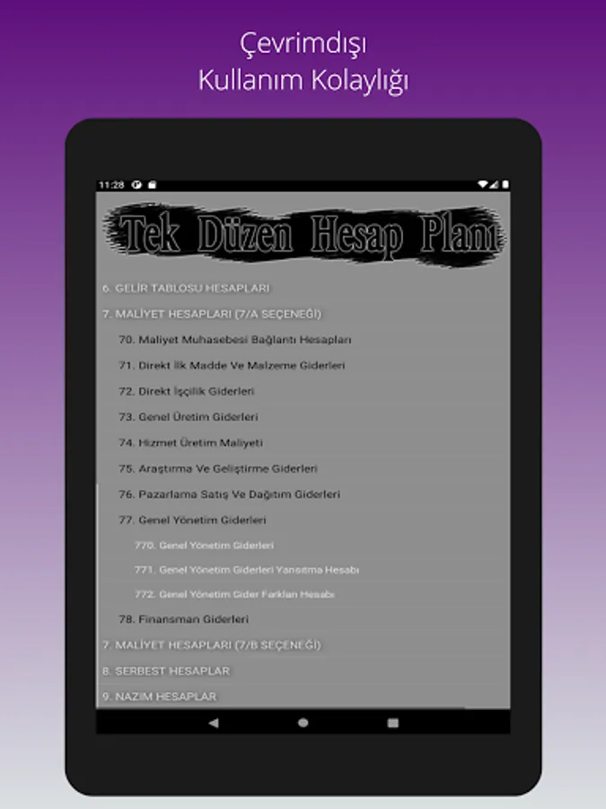 The Uniform Chart of Accounts, which has been used in the Turkish accounting system since 1994, can be viewed on an expandable screen with a classified code layout, and can be used without the need for internet.