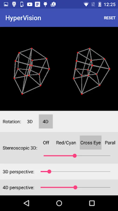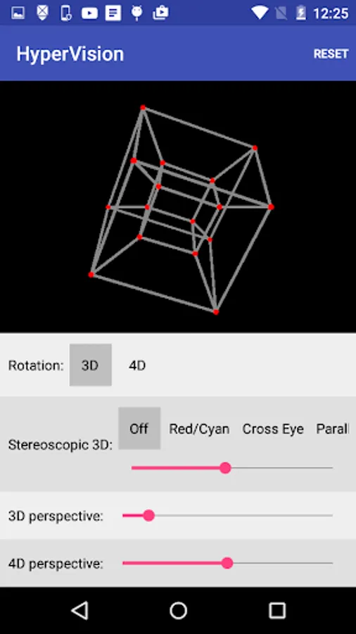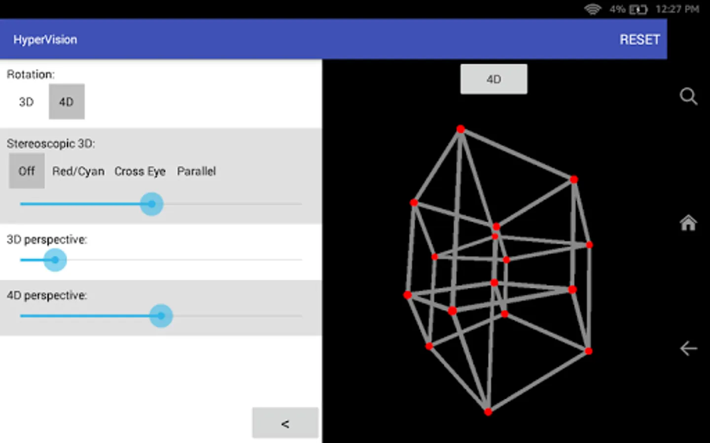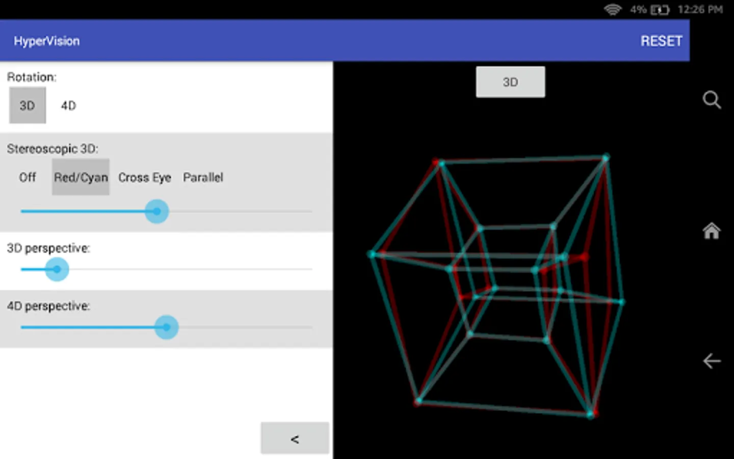 In HyperVision, you can rotate the hypercube in 3 dimensions and 4 dimensions. You can also view it in 3D by using 3D glasses or by going cross-eyed.