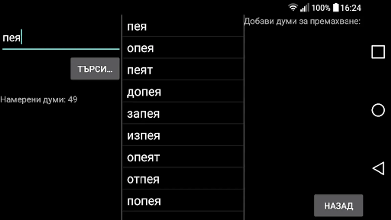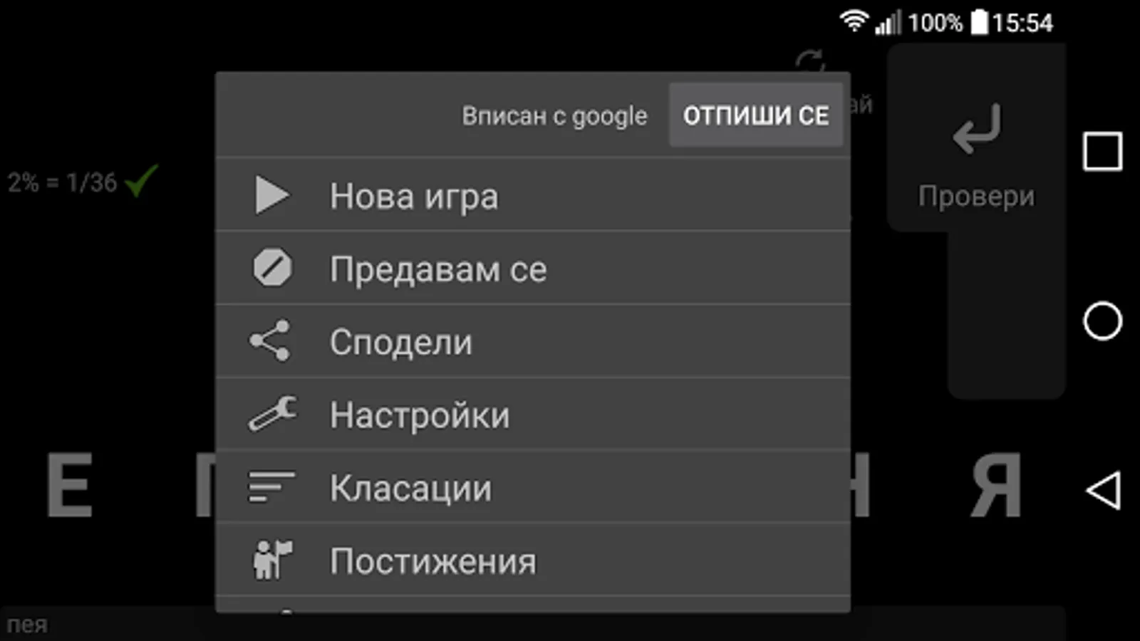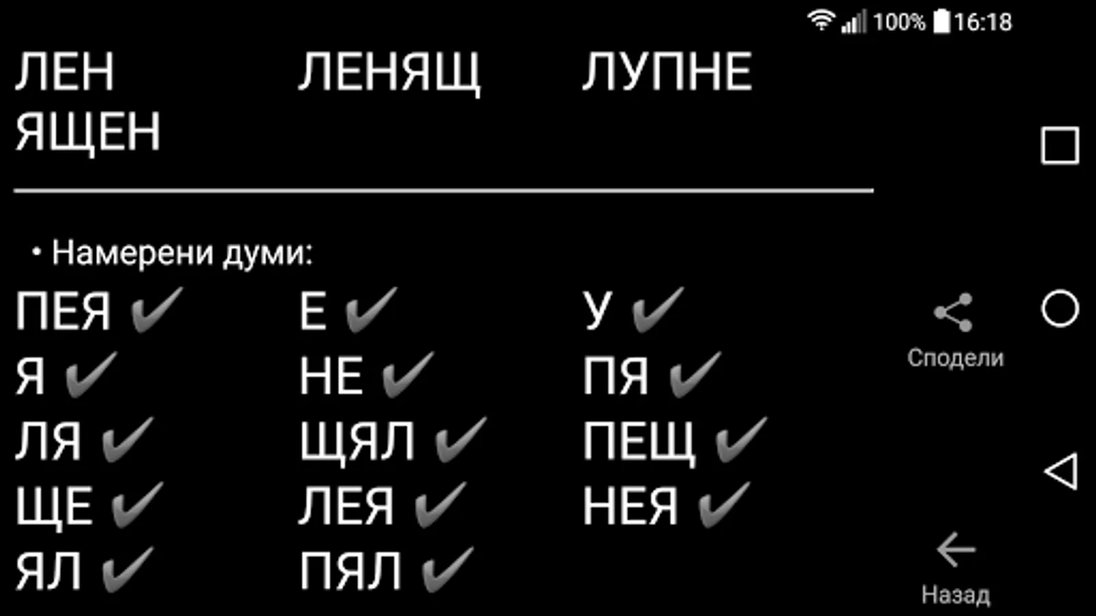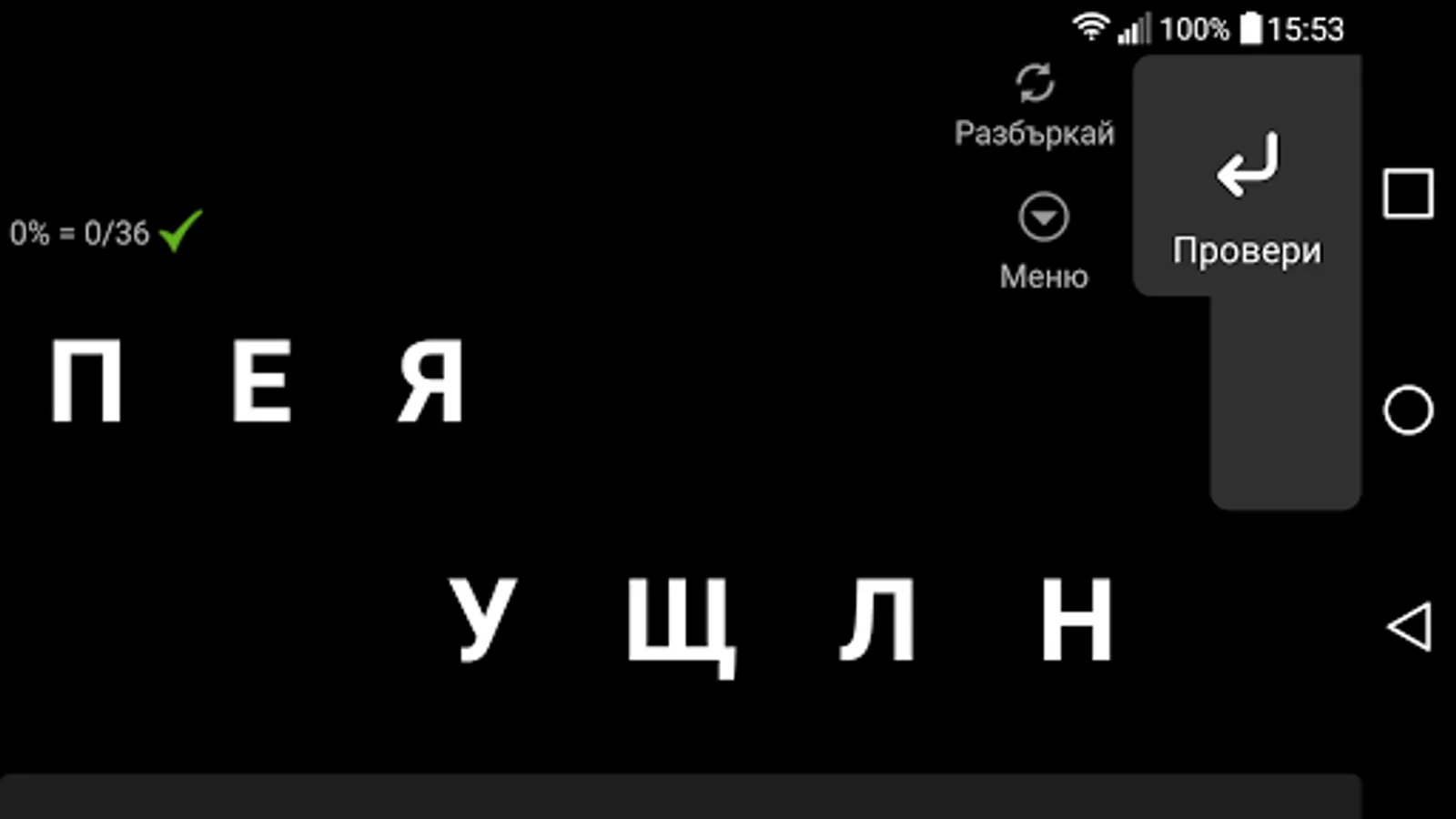 За да проверите дума: докоснете буквите в правилния ред (те ще се качат на по-горен ред). После докоснете големия бутон "Провери" горе вдясно.