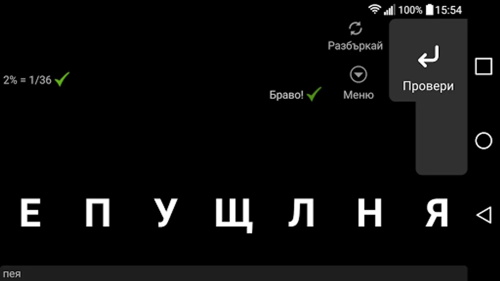Пример: ако имаме буквите "ЕПУЩЛНЯ" то можем да напишем думата "ПЕЯ", като първо докоснем буквата "П", след това "Е" и накрая "Я". Докосваме "Провери" и на екрана ще се появи "Браво!". Ще се увеличи и броячът вляво на 1/36, което следва да се чете: намерена една от общо 36 думи.