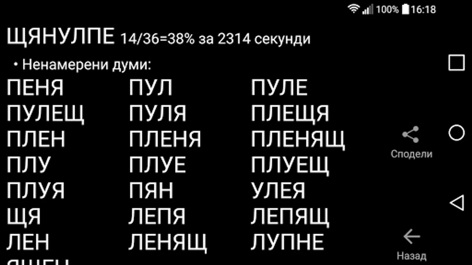 Страница с резултатите е екран, на който с големи бели букви са изписани ненамерените, а по-надолу и намерените думи. Те могат да бъдат докоснати и ще се отвори речника на Читанка (необходим е Интернет).