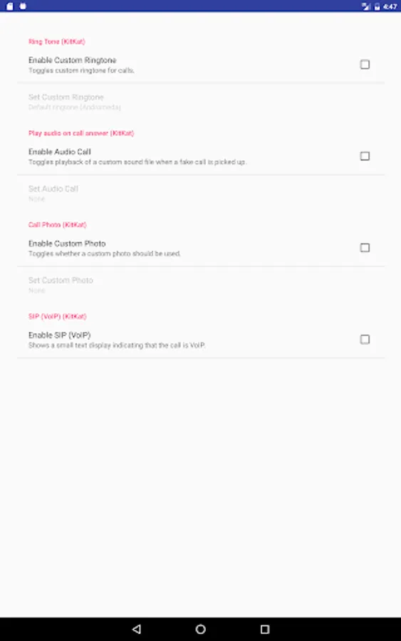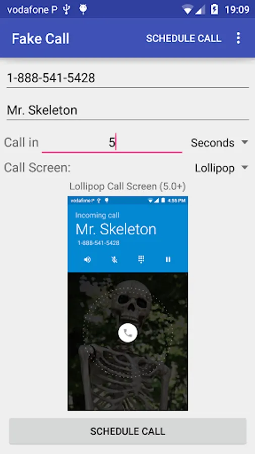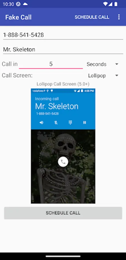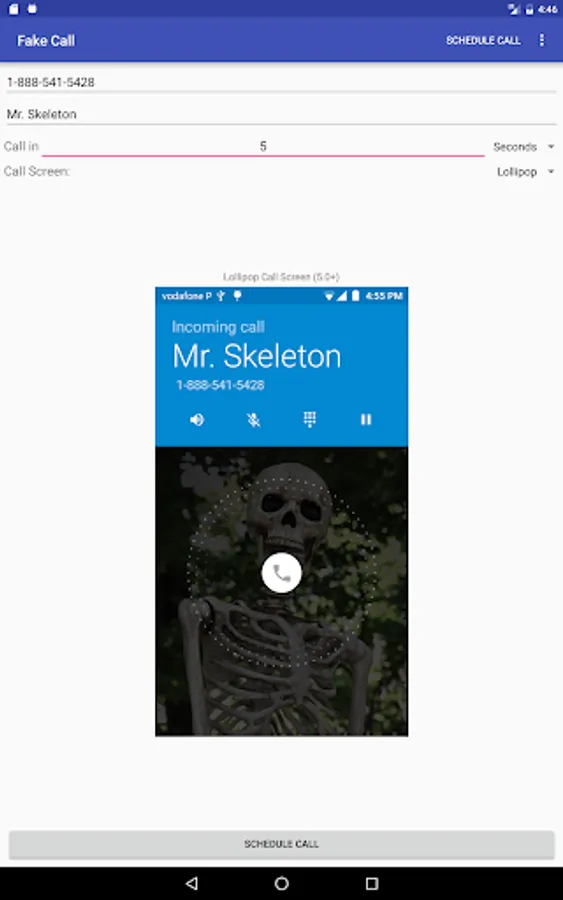 Start the application and fill in the caller name, number, and the time delay you wish to have for the call, then press Schedule call. If you change your mind, you can cancel the call with the Reset Call button at any time, even if you have closed the app since then.