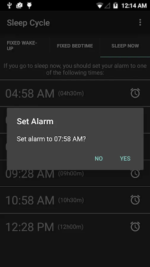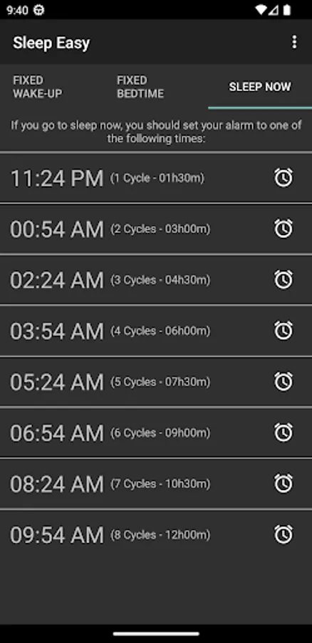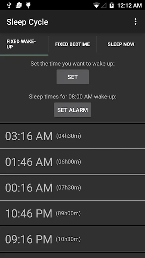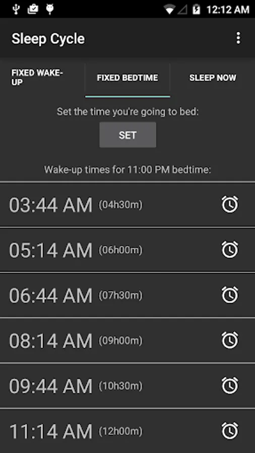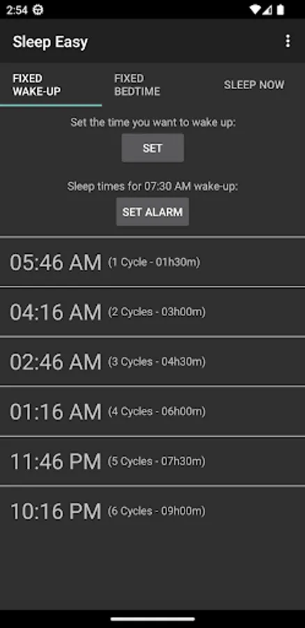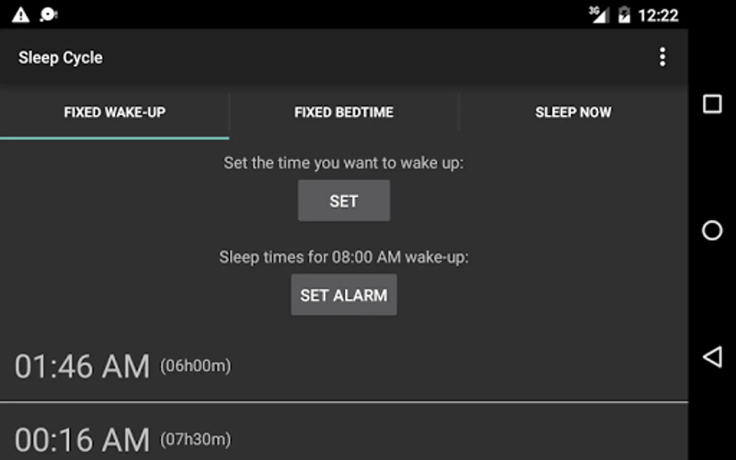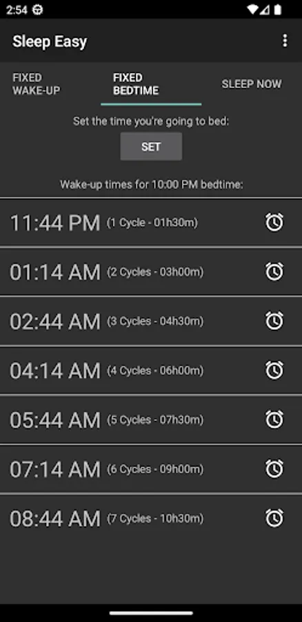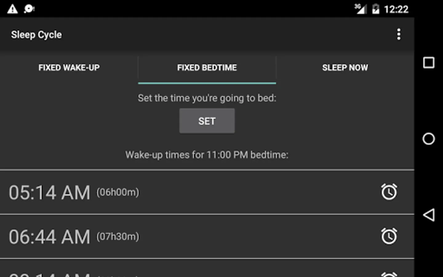 - Fixed Bedtime: Similar to above, but instead specifying the time you're going to bed, listing the optimal times to wake up.
