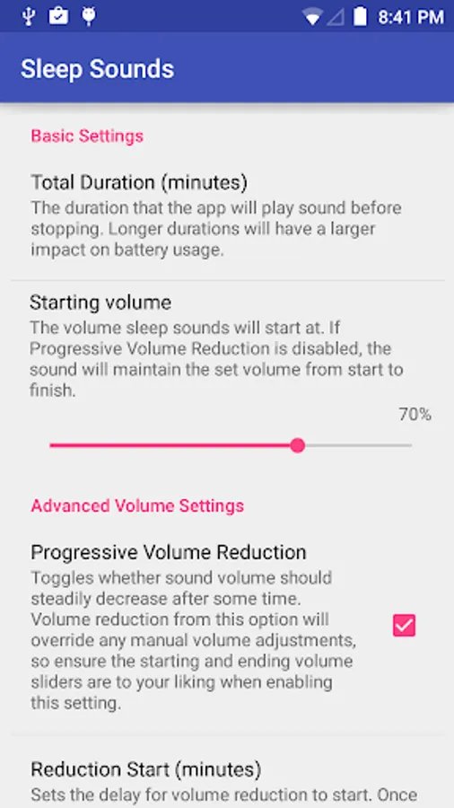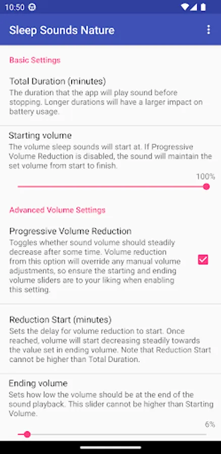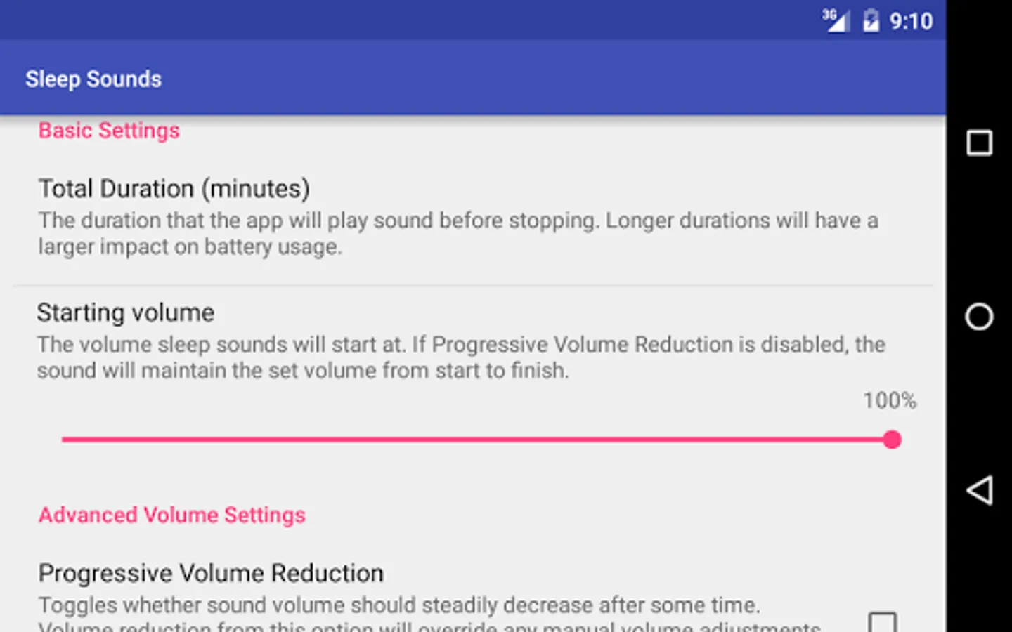 - Progressive volume reduction, with custom starting and ending volume settings, to help you ease into sleep