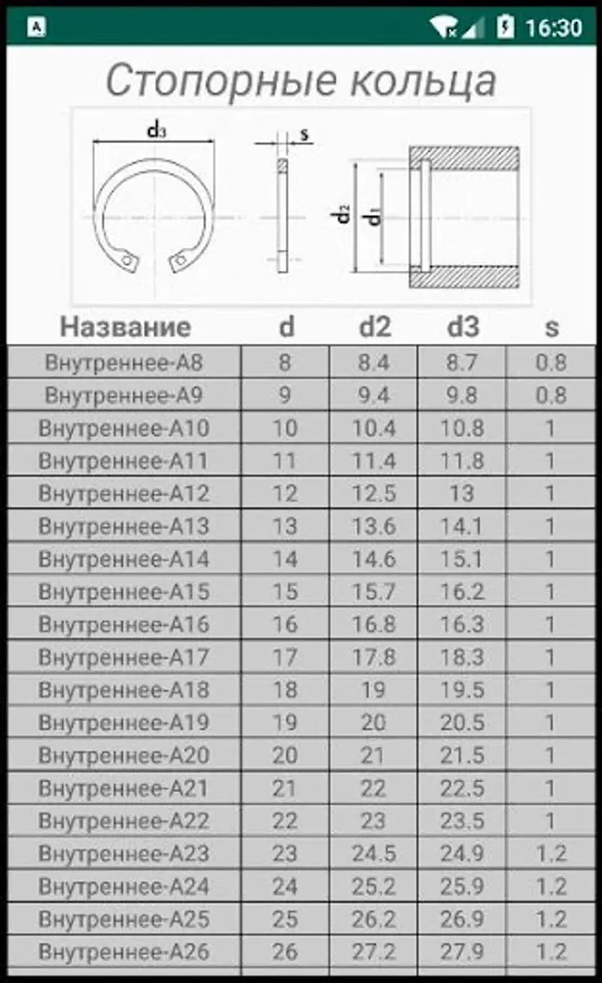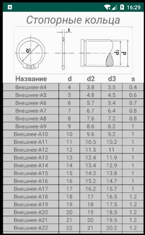 The catalog reference book of lock rings (internal and external) GOST G-13942 and G-13943. Drawings and dimensions of snap ring grooves. The directory is an offline application and does not require an internet connection. However, it does not take up much space in the phone’s memory