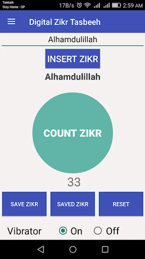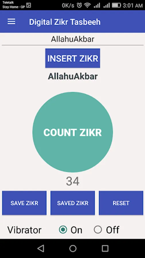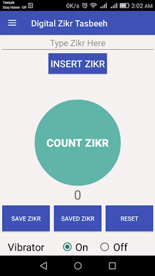 This Digital Tasbeeh Counter has a large button to count the tasbeeh very easily. You can write and insert dhikr or any dua in any language (Arabic, Albanian, English, Bengali, Hindi, Turkish, Urdu, Bosnian, etc). The counter of dhikr will not be erased even after closing the Digital Tasbeeh. When you restart or open your app again, the last dhikr number with all information will simply show up on the app screen. You need to tap or click the dhikr button to pulse and start counting again from the previously counted number. It has a vibrator mode too to reread Dhikr and count more easily. You can able to switch on or off the vibration button at any time.