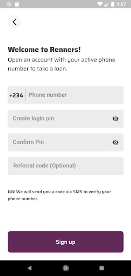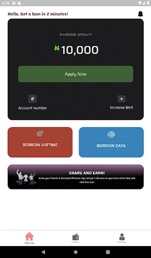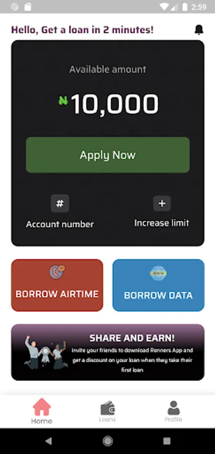 Renners offers loans in 3 minutes or less. With no paper verification, you may improve your credit score and extend your credit limit by making timely payments. All you need is your basic information, BVN, and a smartphone.