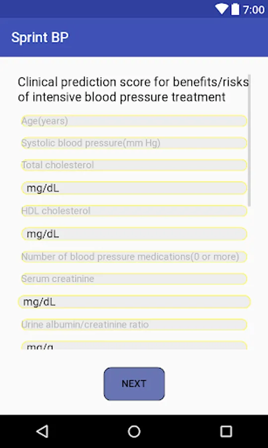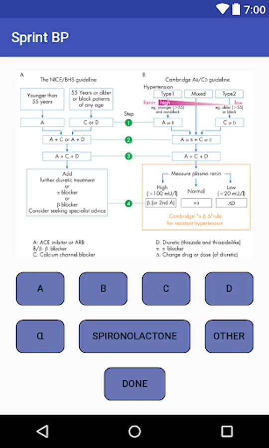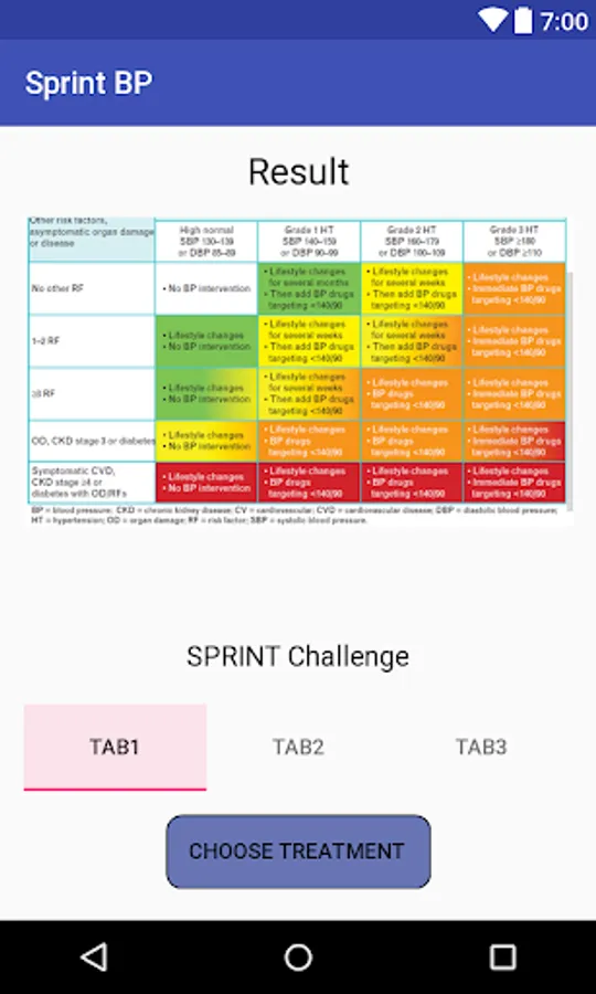 The purpose of this app is to individualise the intensification of blood pressure management. To do this the app uses individual patient data from two large clinical trials, SPRINT and ACCORD. The SPRINT trial randomised patients to either a systolic blood-pressure target of less than 120 mm Hg (intensive treatment) or a target of less than 140 mm Hg (standard treatment). By comparing the profile of your patient to profiles of patients in these studies treatment can be optimised to balance benefit versus risk of antihypertensive treatment intensification.