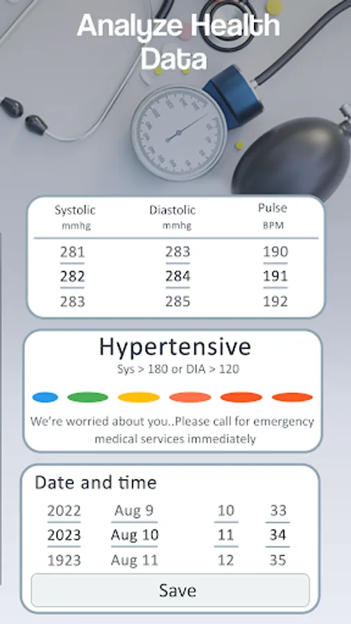 - Users will enter blood pressure data based on three values: Systolic (SYS), Diastolic (DIA), and Pulse.