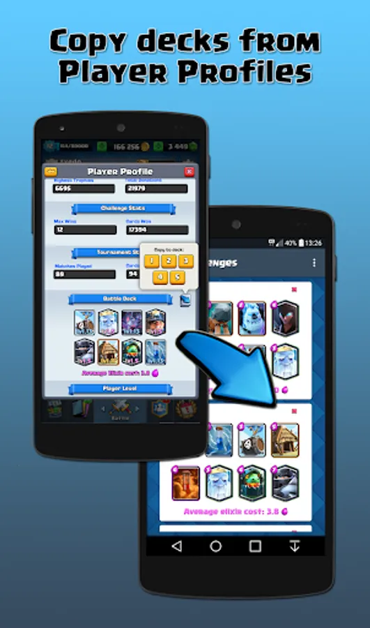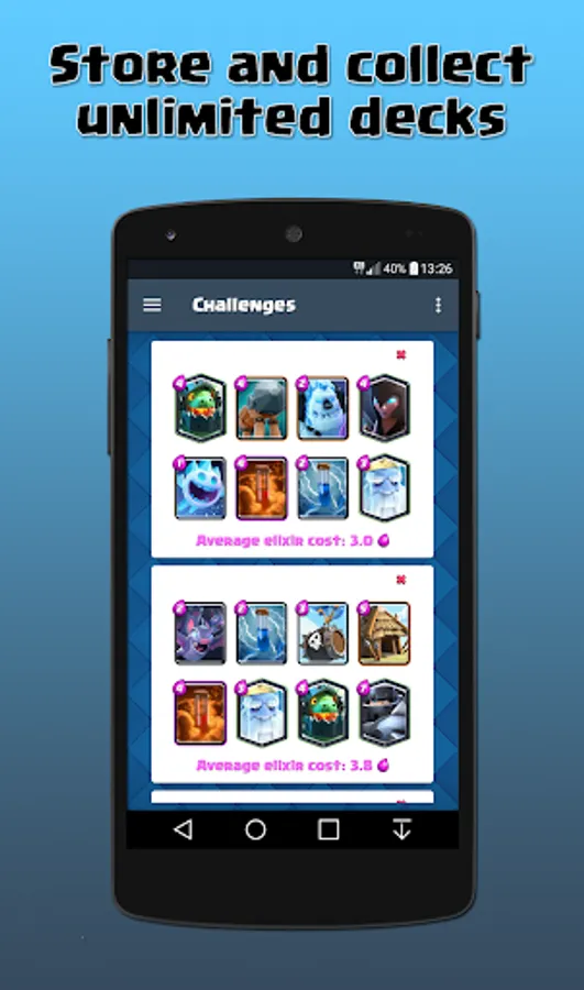 Save and collect unlimited decks in your Deck Wallet, and copy them back to the game with one touch. Organise your decks in collections for any game mode: ladder, challenges, tournaments or 2 versus 2!