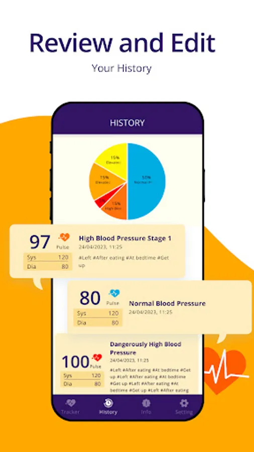 This blood pressure log bp tracker app helps users record their blood pressure. In addition, the application also provides basic to advanced knowledge about blood pressure.
