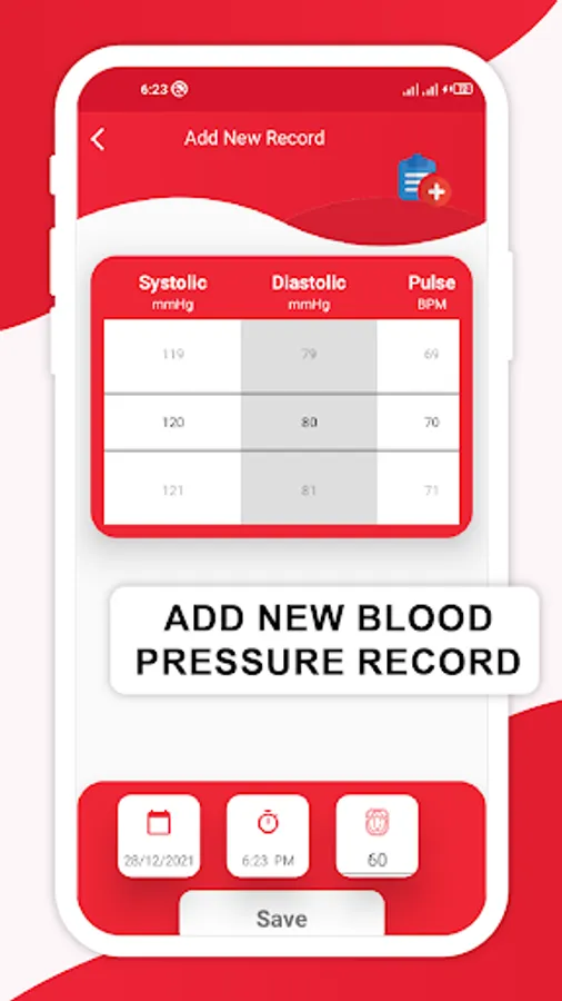 Open bp diary and click on the record button, you will go to record bp where your can adjust your systolic, diastolic and pulse with different date , time and weight