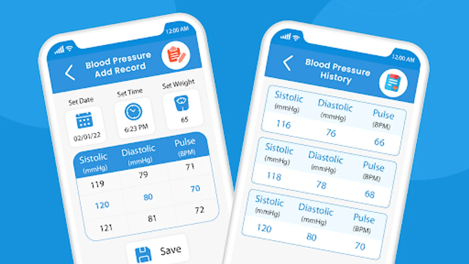 • Blood Pressure Data saved on the basis of Systolic, Diastolic and pulse also moreover date, time and weight is also saved