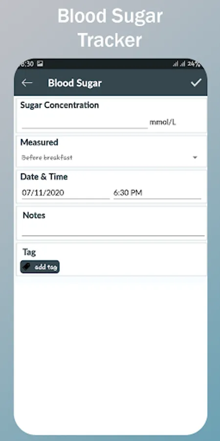Add tags to each record – so with the help of diabetes logs you will find out your diabetes dynamics, for example, before meals, before breakfast, after lunch, after meals, In Morning, evening etc.