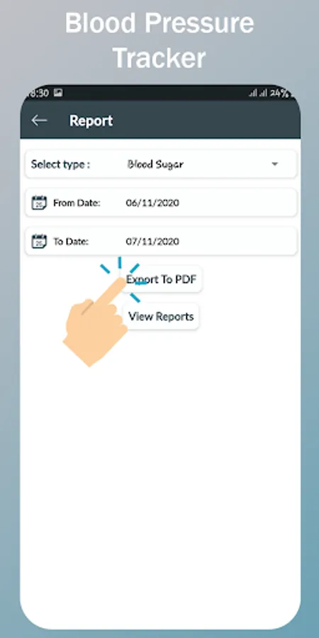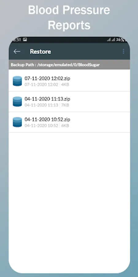 You can export health report in pdf or excel format file. Later you can open, share, and delete these files. You can take backup of your health data on your local device or on google drive. You can restore old health data from backup.