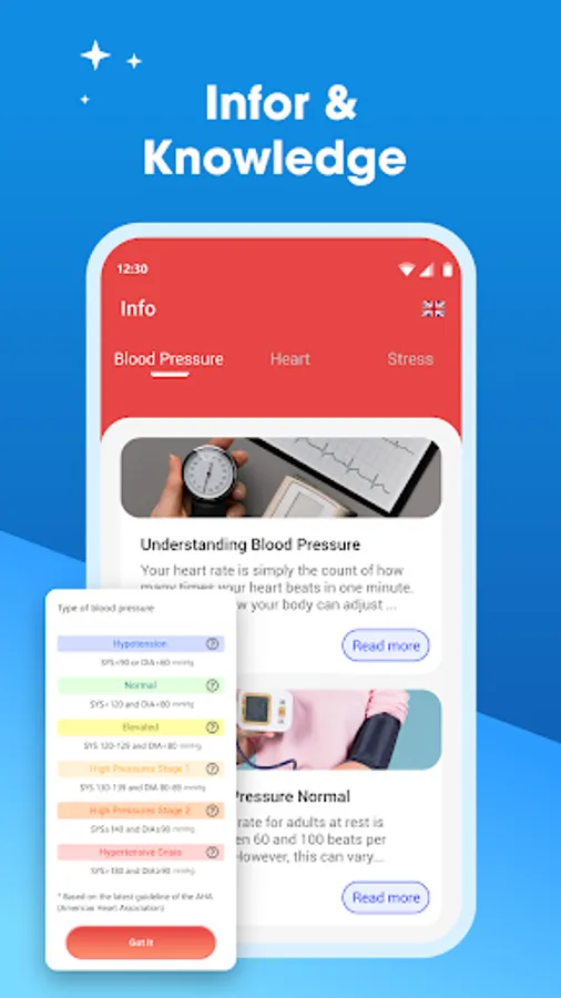 ♥ Understand heart and blood knowledge: The application provides all information about blood pressure, such as hypertension, hypotension, and how to improve health.
