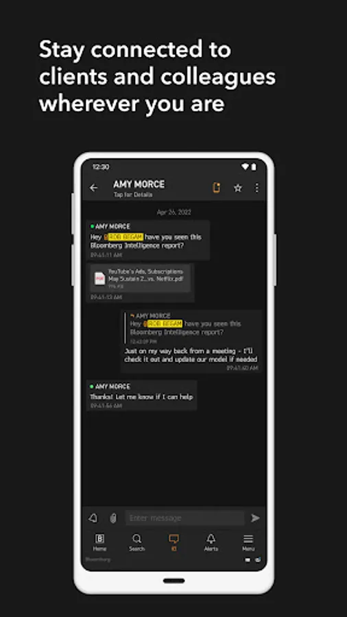 Stay connected to breaking news, markets, clients and colleagues with on-the-go access to key Bloomberg Terminal functionality.