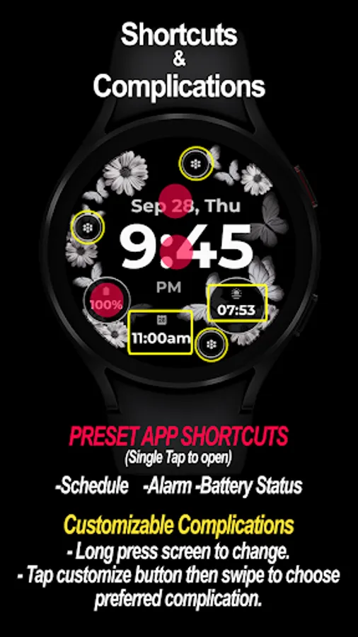 -Preset App Shortcuts (Single tap to open/ fixed not editable) Calendar, Battery & Alarm