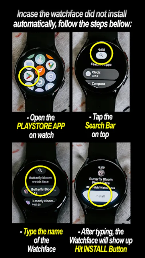 4️⃣ If incase there is no notification, Go to PLAYSTORE ON YOUR WATCH and type on the SEARCH BOX "Butterflies and Flowers""