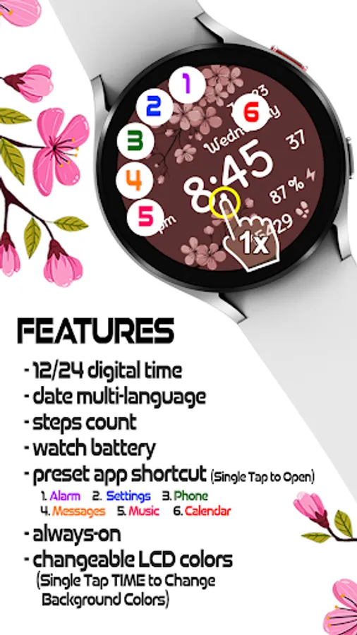* If you are having synchronization problems between your phone and Play Store, install the app directly from watch: search "Sakura Color Bloom" from Play Store ON WATCH and hit on install button.