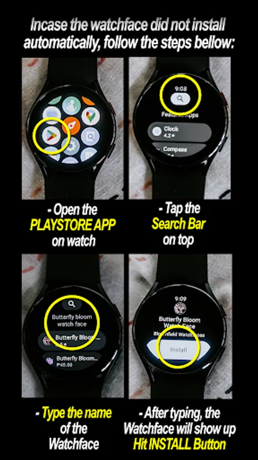 1️⃣ Watchfaces automatically install on watch. (There will be a download icon on screen while installing)