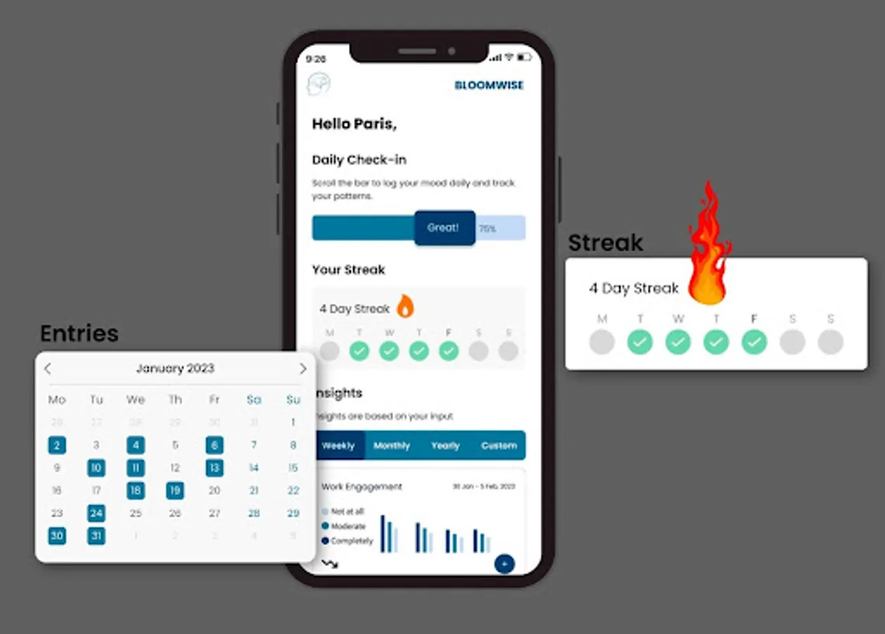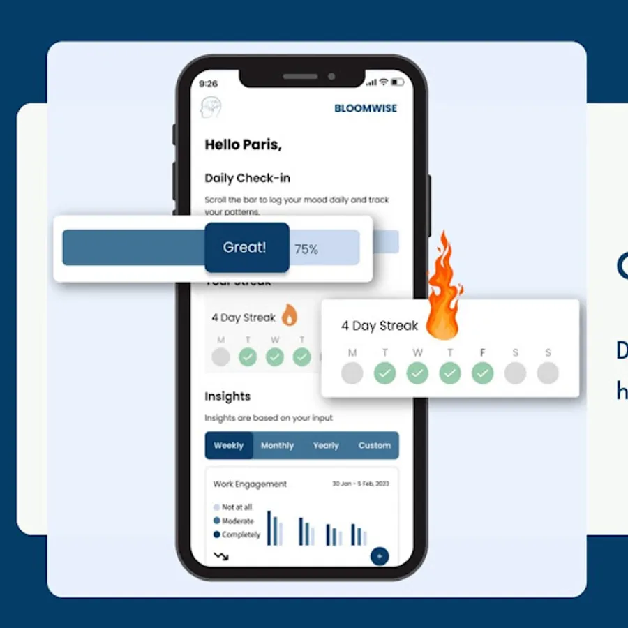 The Bloomwise Workplace Mental Health app gathers key metric data of workplace health and mental health. Employees can track their mood, stress, and workplace engagement on a daily basis. This can help them identify valuable trends to better manage their workplace mental health.