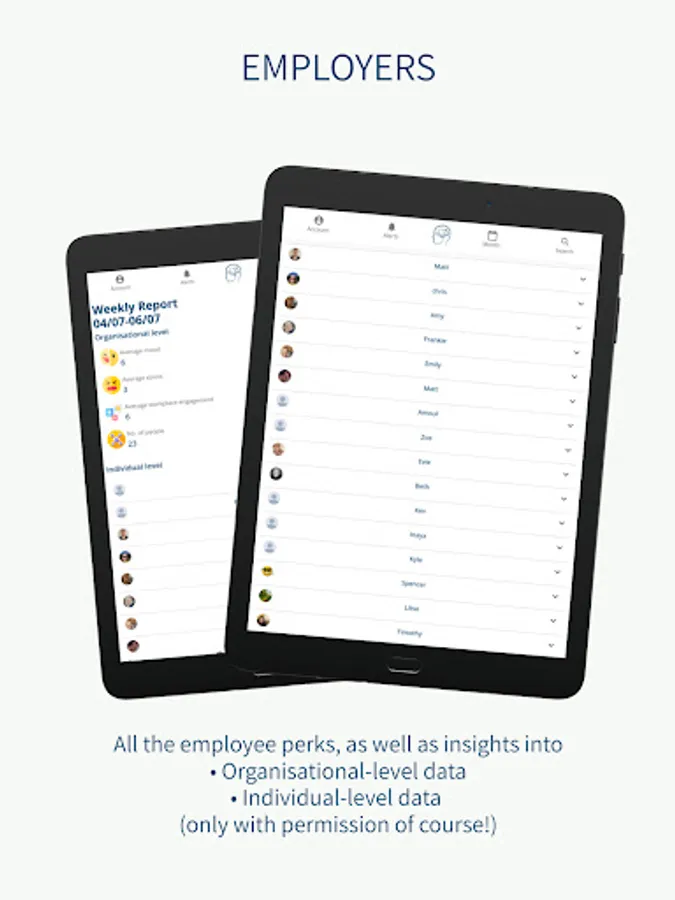 Employers have a full overview of their organisation's stress, mood, and workplace engagement data. If employees have allowed them to do so, employers can also have an overview of individual-level data. This will allow them to predict and pre-empt the losses that companies make when their staff are mentally unwell by providing appropriate measures.
