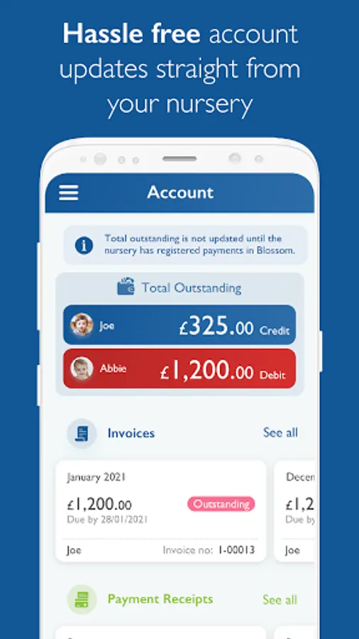 The Eden Nursery Parent App helps to connect parents with their children and the nurseries which look after them. Engage in your child's day with a real-time diary feed, displaying everything from sleeps to activities, snacks to nappy changes. Parents can even share developmental moments from home with the nurseries, creating a stronger communication to support your child in their first years. With a brand-new dedicated account section, you can find your invoice details and payment receipts all in one place.