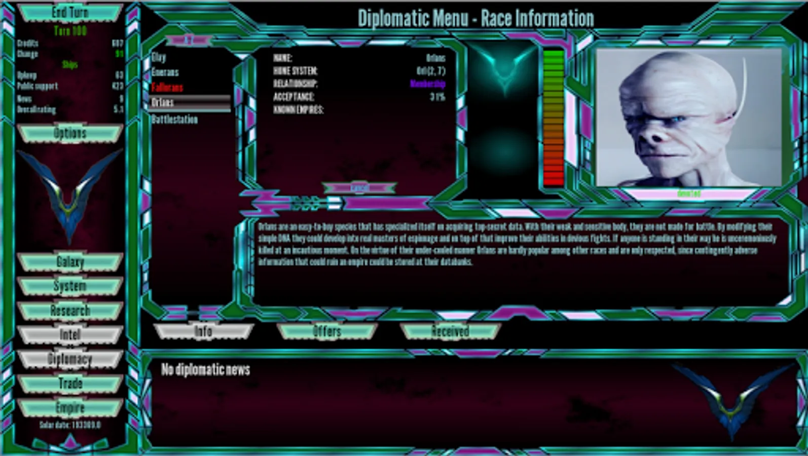 Birth of the Empires (also known as BotE) is a turn-based 4X strategy game set in space in the style of classics such as Microprose's Master of Orion 2 or ST: Birth of the Federation. By choosing one of six major races aim is to gain control and supremacy over a part of the galaxy, either by diplomatic or military means. Further victory conditions are available at game start.