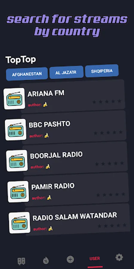 TopTop is where the real fun begins. Listen to your favorite radio sites and streams, and if you already have your own DJ station or radio, feel free to share we don't bite. Rate other radio stations and DJ stations and help the best ones get to the top. If you notice a song you like, you can search for it through Google Play Music and a host of other search engines! Record streams and save songs for later, happy listening!