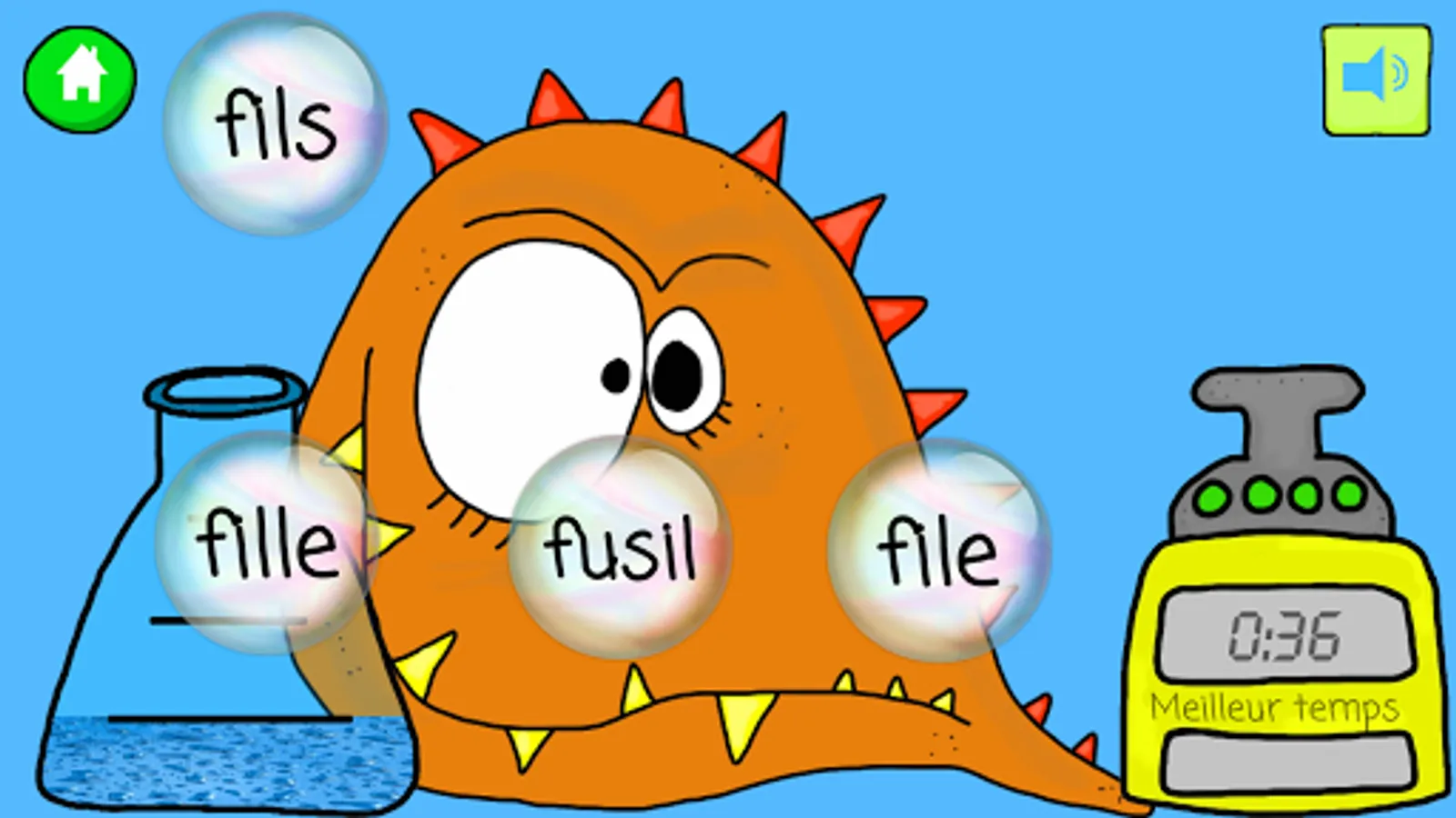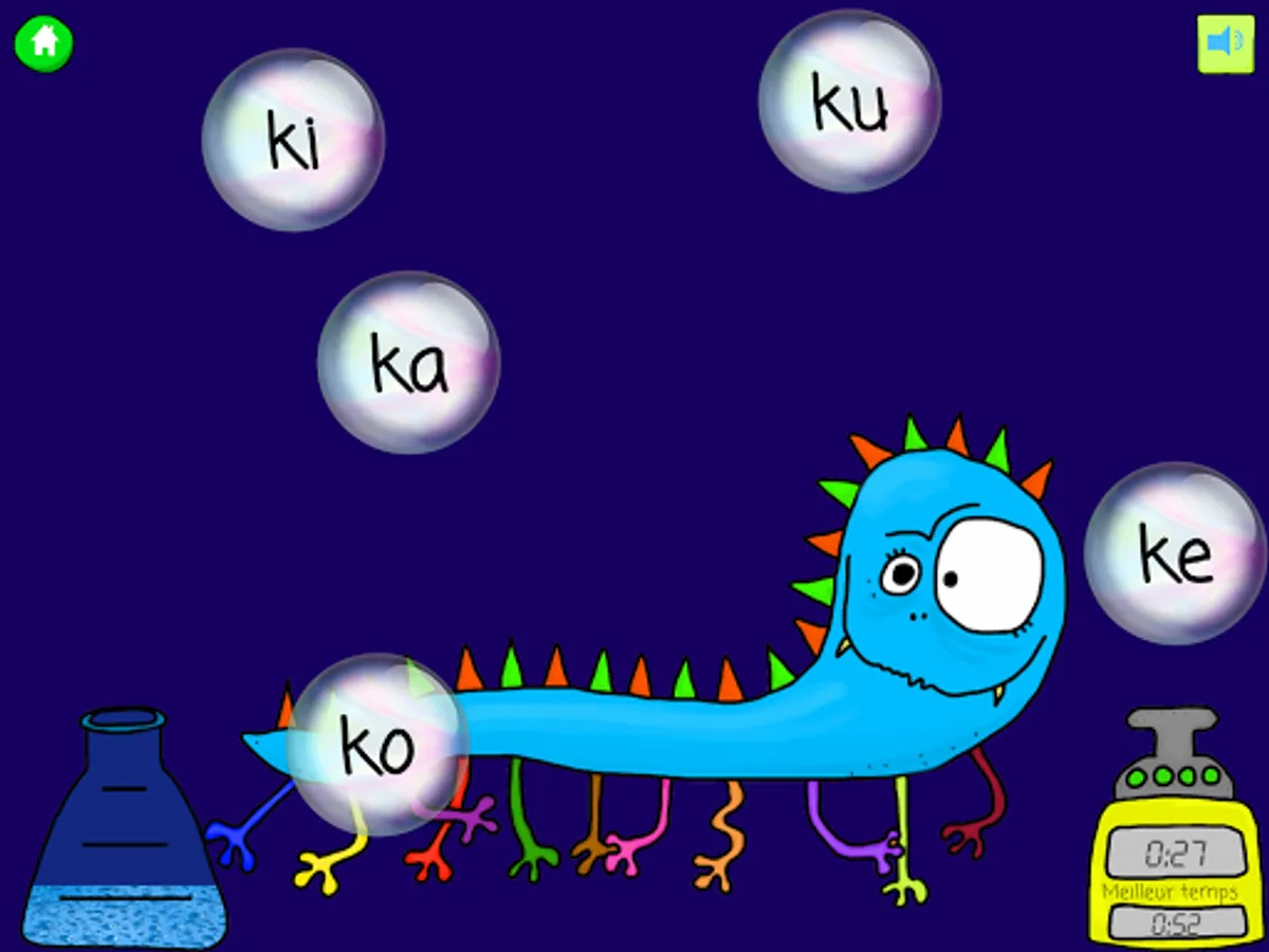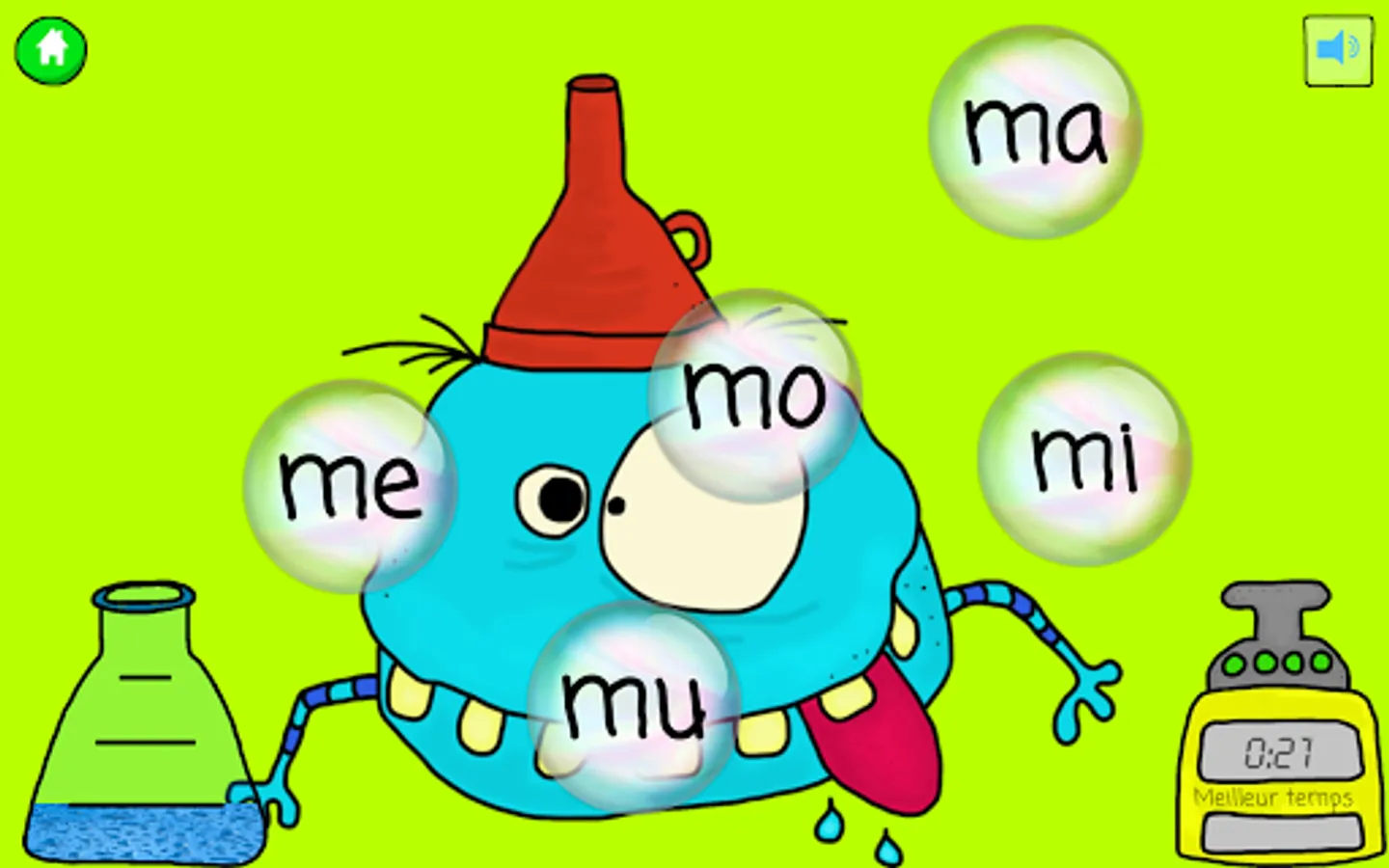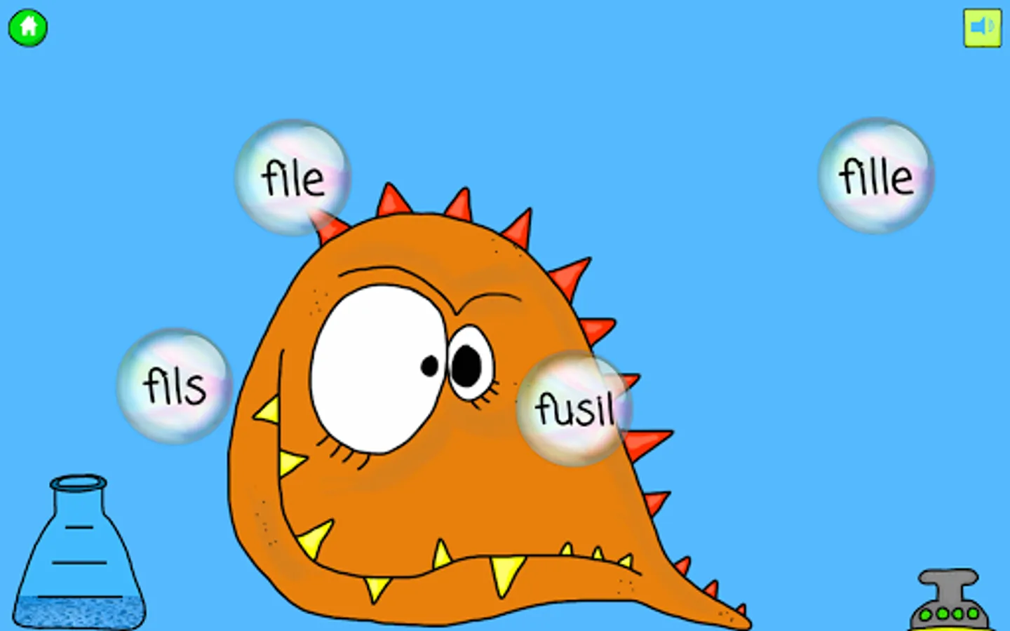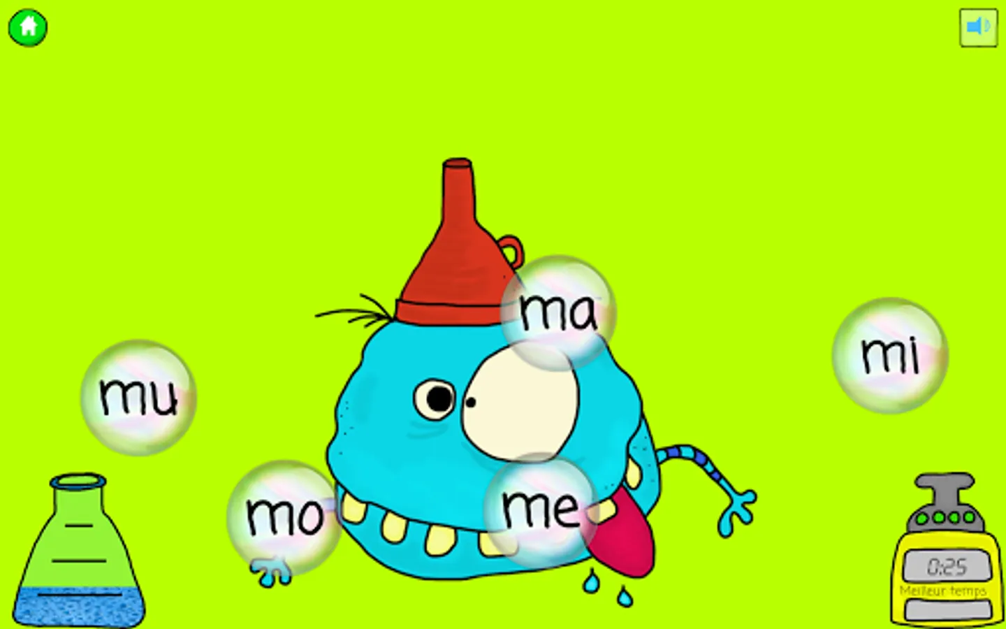 The player must listen to the syllable, syllable structure or the word given orally and then locate the correct answer from the bubbles proposed by monsters. After 5 successful, the player gets a game page 5 seconds after 20 successful (all filled vial), the player is led to the discovery of a new monster, where the complexity of the syllables reading is slightly more complex. For the learner, the goal is to raise as much as possible monsters and improve its own time if it takes a monster! Learning to read becomes monstrously fun!