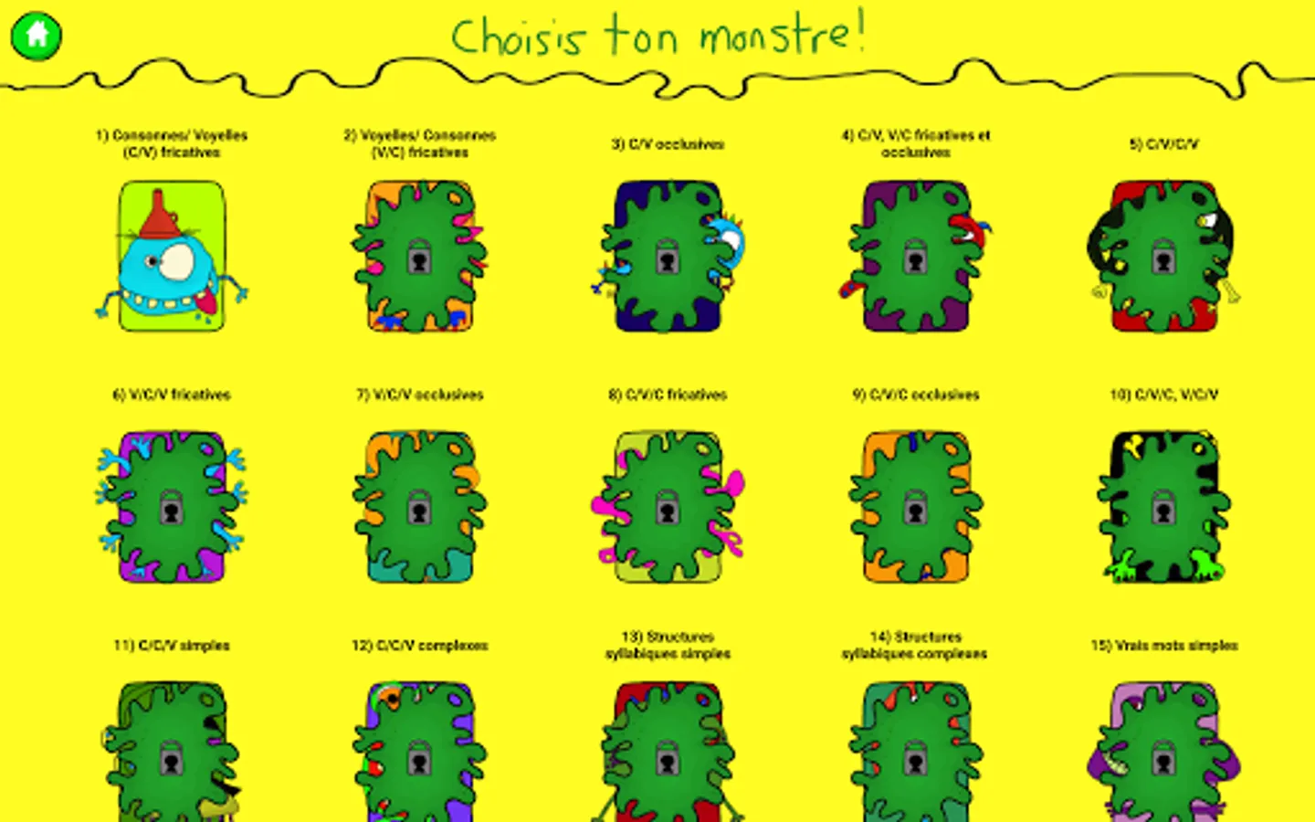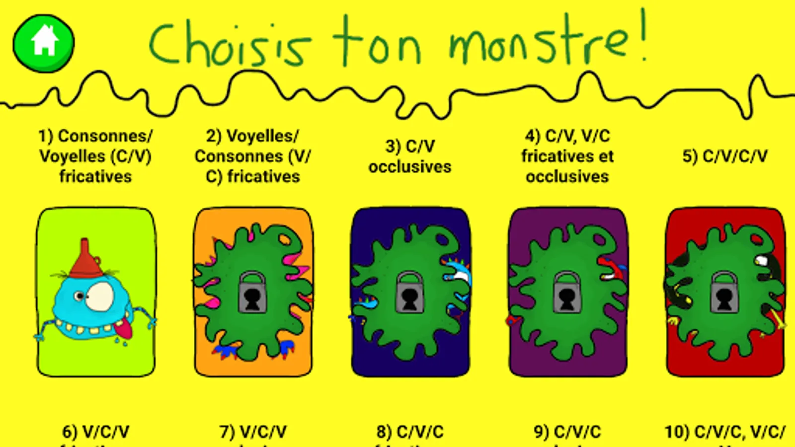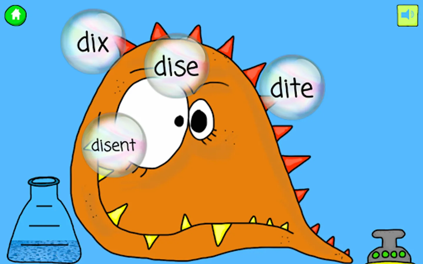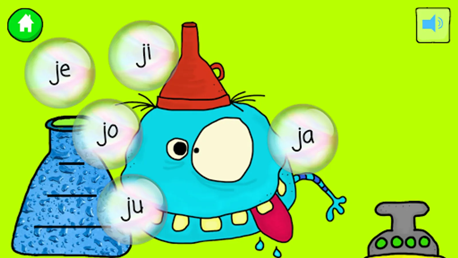 The player must listen to the syllable, syllable structure or the word given orally and then locate the correct answer from the bubbles proposed by monsters. After 5 successful, the player gets a game page 5 seconds after 20 successful (all filled vial), the player is led to the discovery of a new monster, where the complexity of the syllables reading is slightly more complex. For the learner, the goal is to raise as much as possible monsters and improve its own time if it takes a monster! Learning to read becomes monstrously fun!
