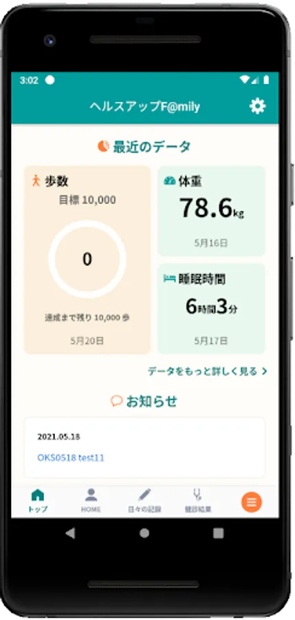 With the "Health Up F @ mily" app, you can collect information and manage your health activities by linking data with Google Fit and health devices. In addition, by linking with the health management service "Health Up F @ mily / Web", we support a wide range of health management such as referencing the results of medical examinations.