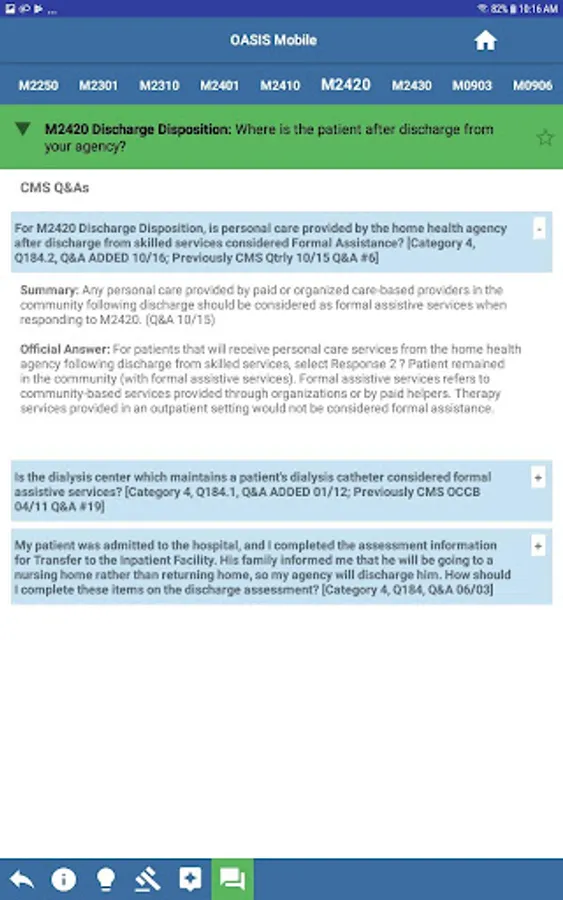 HH OASIS Mobile provides official instruction from CMS’s OASIS Guidance Manual, the CMS OASIS Q&As, the Wound Ostomy and Continence Nurses Society (WOCN) and the National Pressure Ulcer Advisory Panel (NPUAP). That guidance is supplemented with content found within the in-depth articles that make up the OASIS On-the-Go, Reference for Field Clinicians – clinical and documentation tips, as well as prompts and questions to ask the patient to help you accurately assess each item.