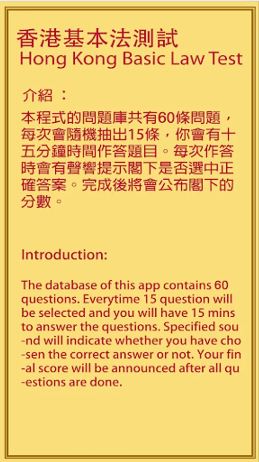 程式的問題庫有六十條問題,供考試者模擬作答基本法測試。