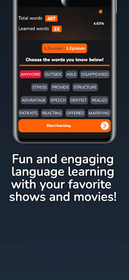 But the best part? Our app provides you with a percentage of coverage for each movie, so you can track your progress and see how much of the movie's language you've mastered. So whether you're a movie buff or just looking for a new and exciting way to improve your English skills, our app is the perfect choice for you. Download it now and start learning!