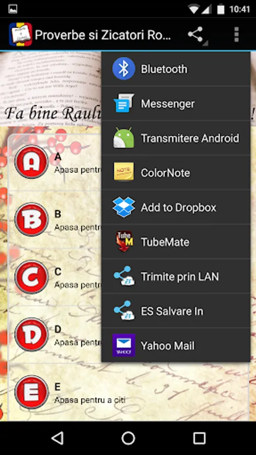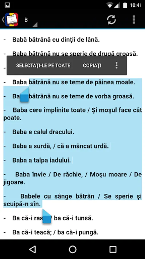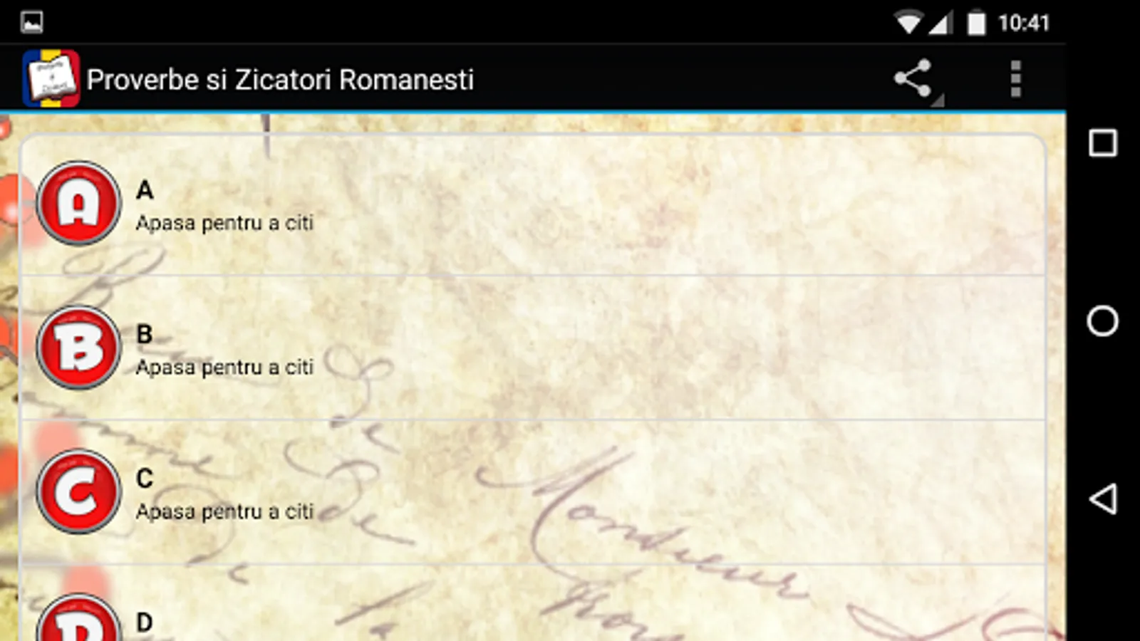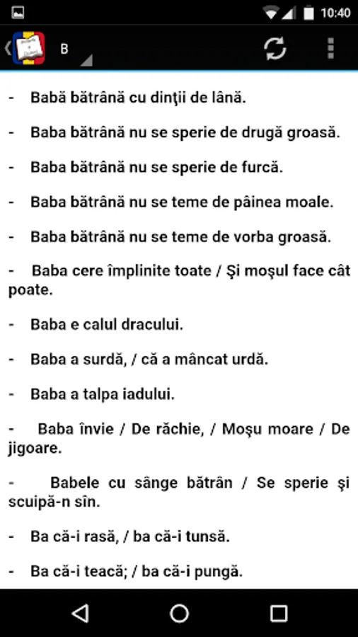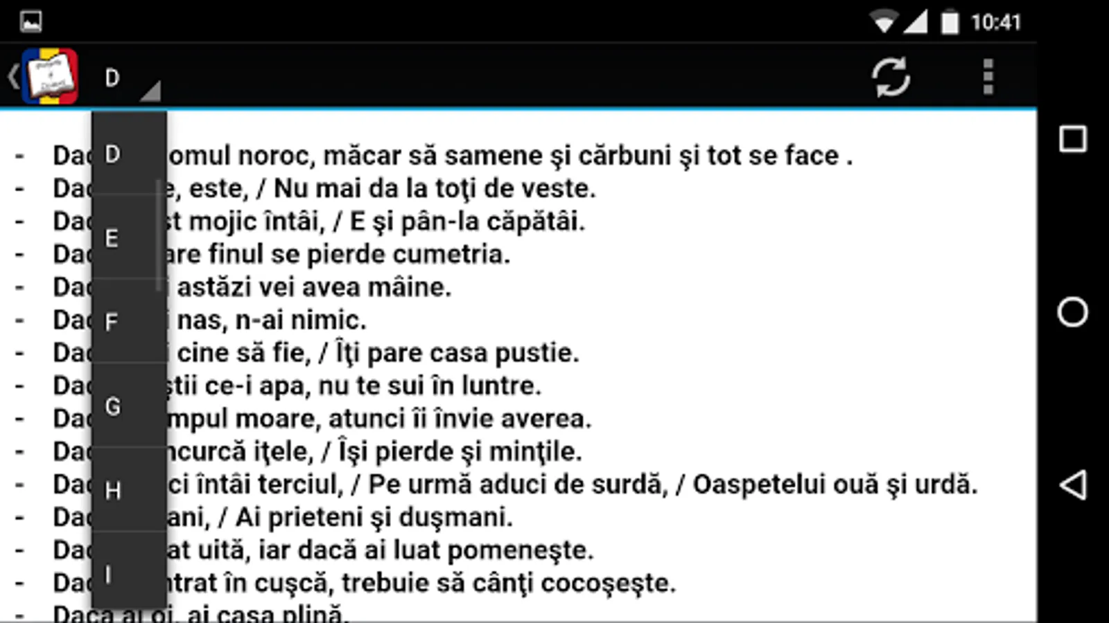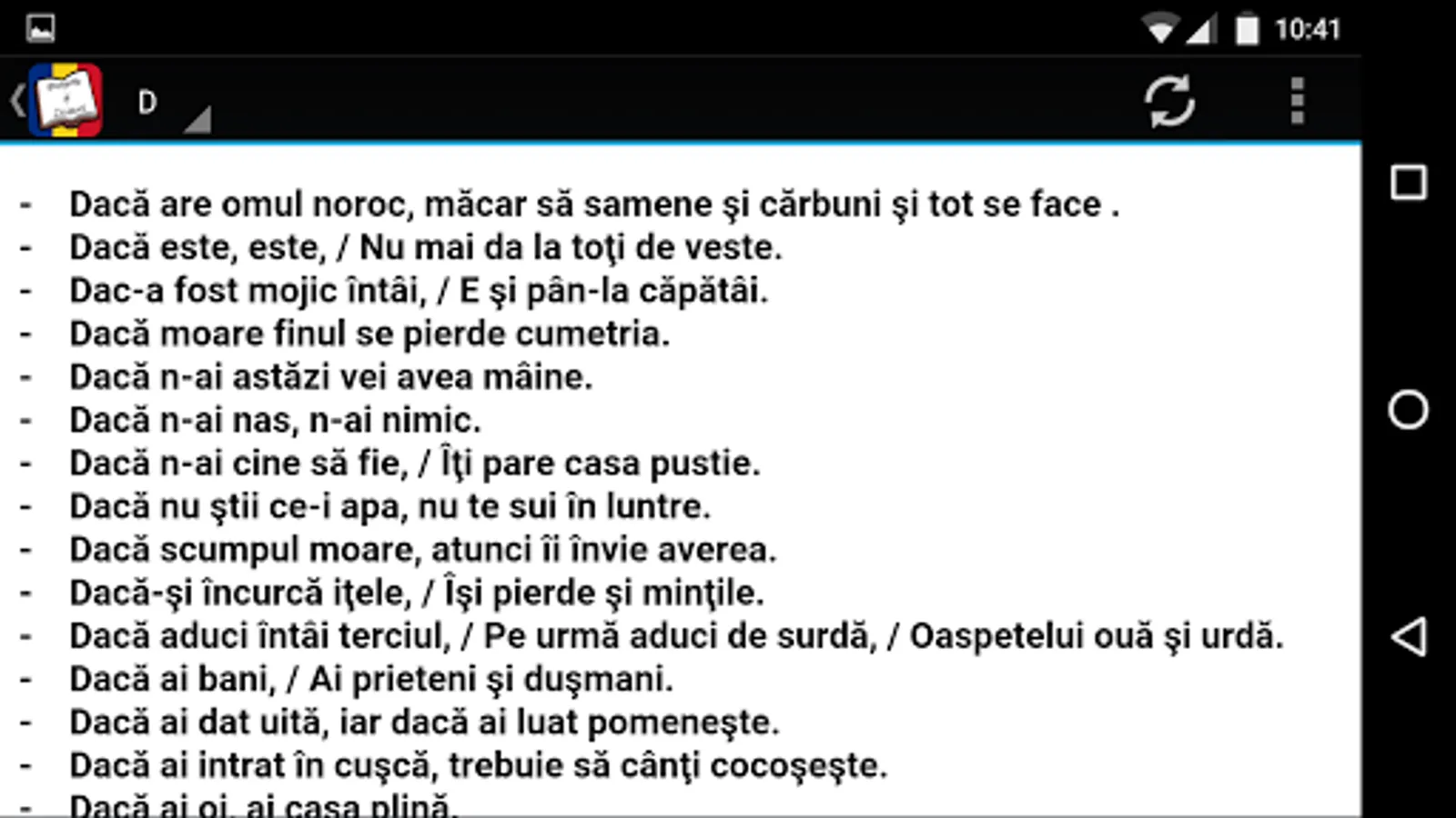 The application contains a series of Romanian proverbs is free and you can select for each letter of the alphabet you want to see ...
