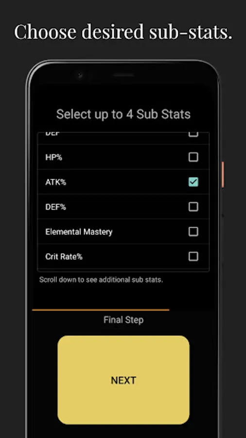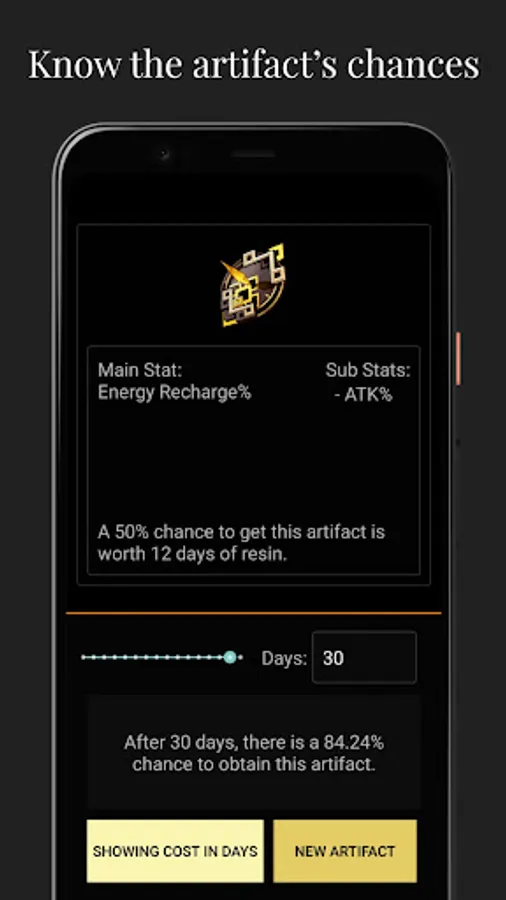 Customize an artifacts type, main-stat, and sub-stats, and know the chance of obtaining it, from the resin cost, to the amount of days of farming.