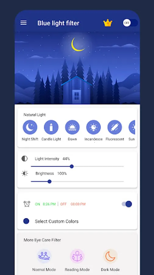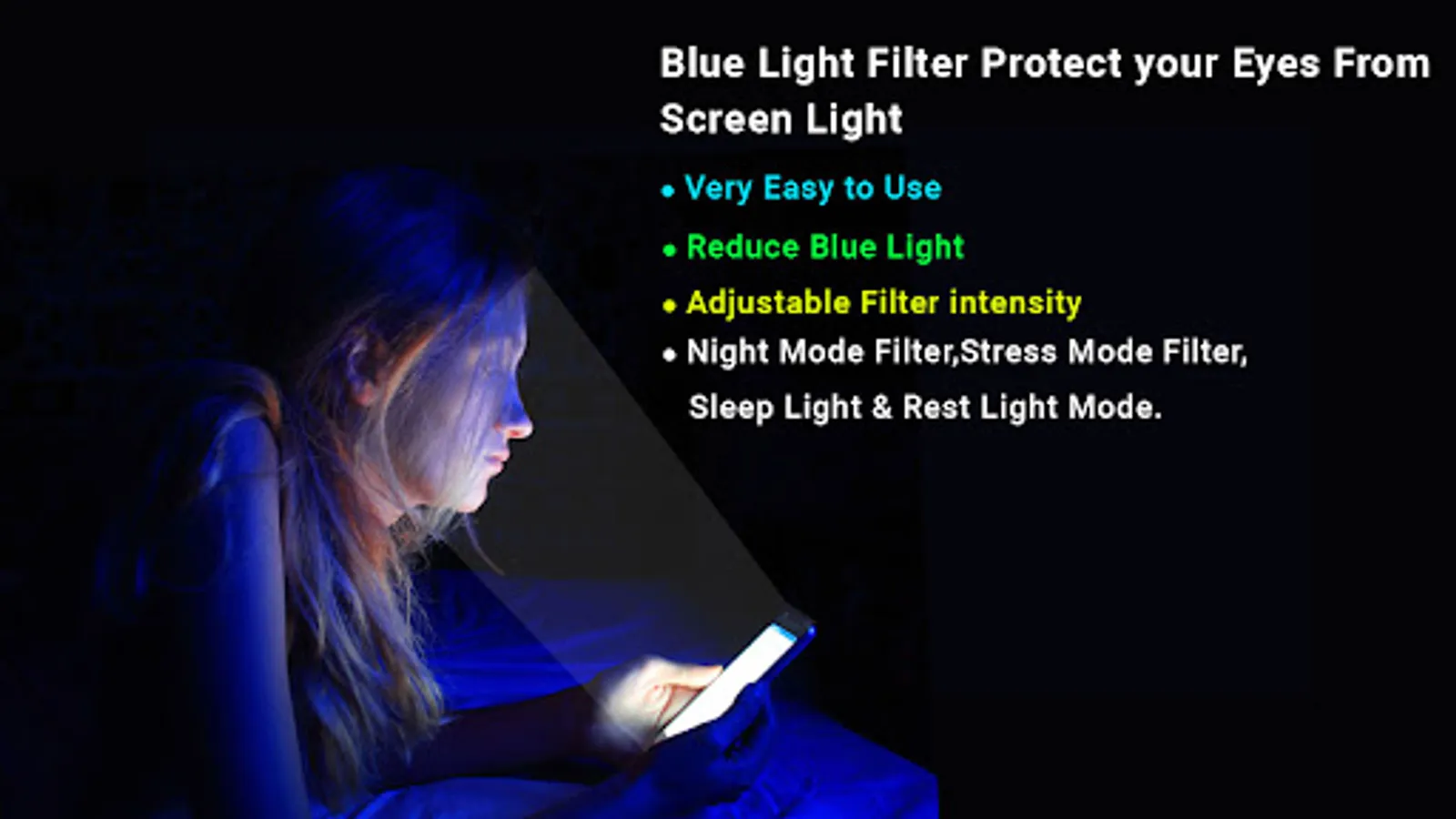 Reduce blue light with Eye Care Light: Blue Light Filter & Night Screen, protect your eyes and sleep easy. Blue light of your phone, tablet may cause strain on your eyes & will not let you sleep easily. For using phone at night, you can reduce blue light of screen, screen dimmer will also let you reduce brightness of your phone and Eye Care Light: Blue Light Filter & Night Screen will be helpful for easy mobile usage and easy sleeping. Night mode screen dimmer & eye protector app has multiple modes of light filters & brightness.