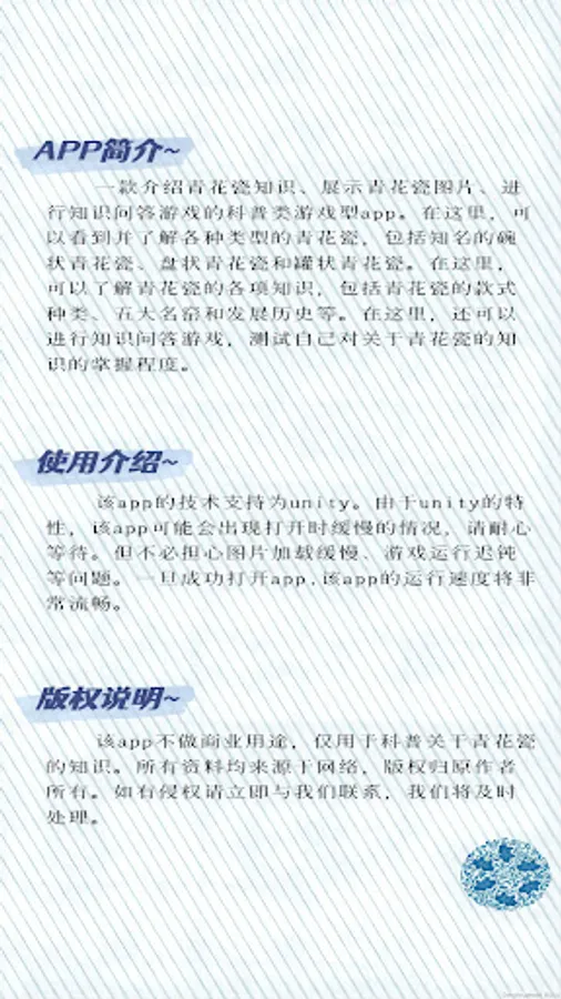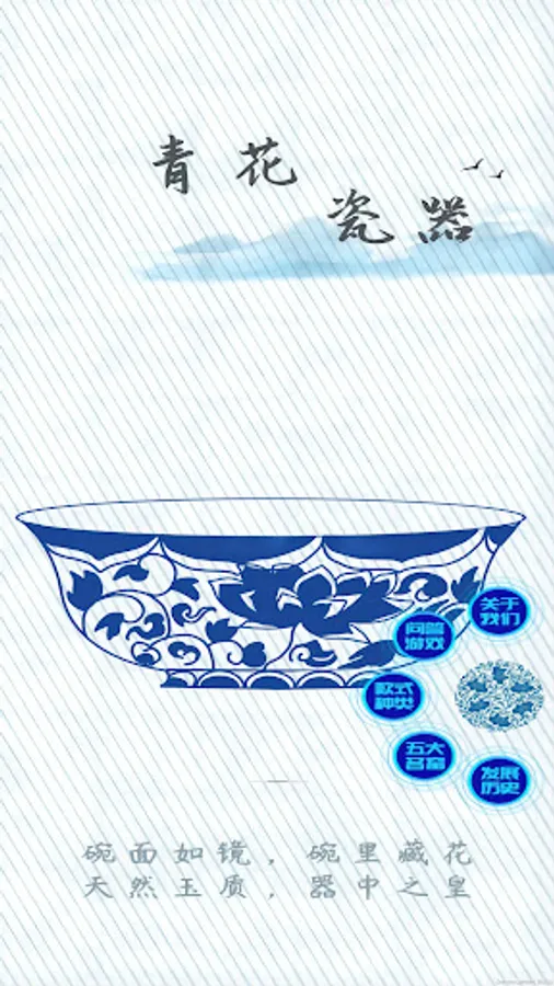 A popular science game app that introduces knowledge of blue and white porcelain, displays pictures of blue and white porcelain, and plays knowledge quiz games. Here, you can see and learn about various types of blue-and-white porcelain, including the well-known bowl-shaped blue-and-white porcelain, plate-shaped blue-and-white porcelain and pot-shaped blue-and-white porcelain. Here, you can learn about various knowledge of blue and white porcelain, including the styles and types of blue and white porcelain, five famous kilns and development history. Here, you can also play knowledge quiz games to test your mastery of the knowledge about blue and white porcelain.