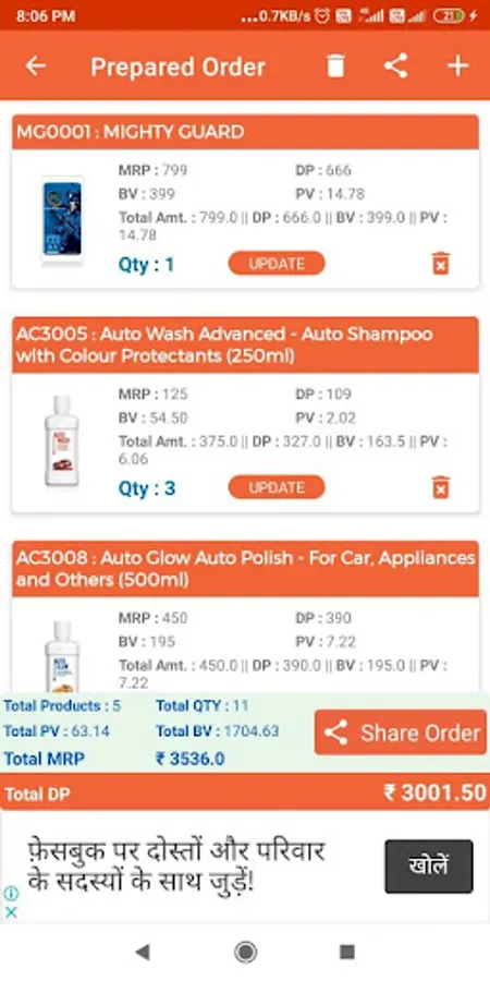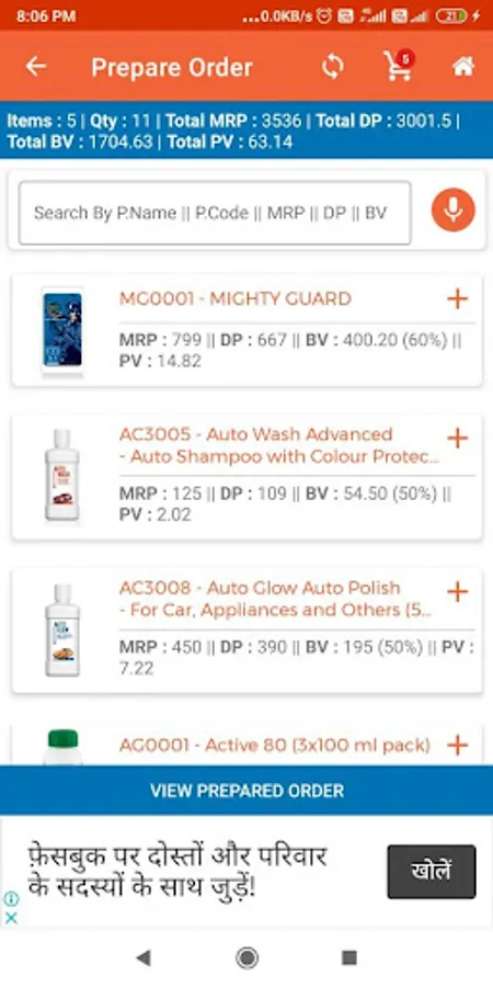- Product List with product Maximum Retail Price (MRP), Distributor Price(DP), Business Volume(BV), Point Value (PV), Product Code of each product with its Image.