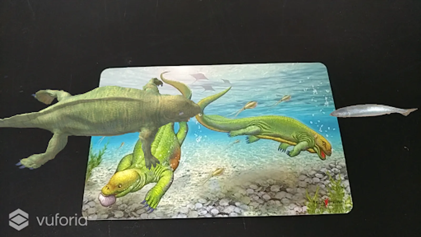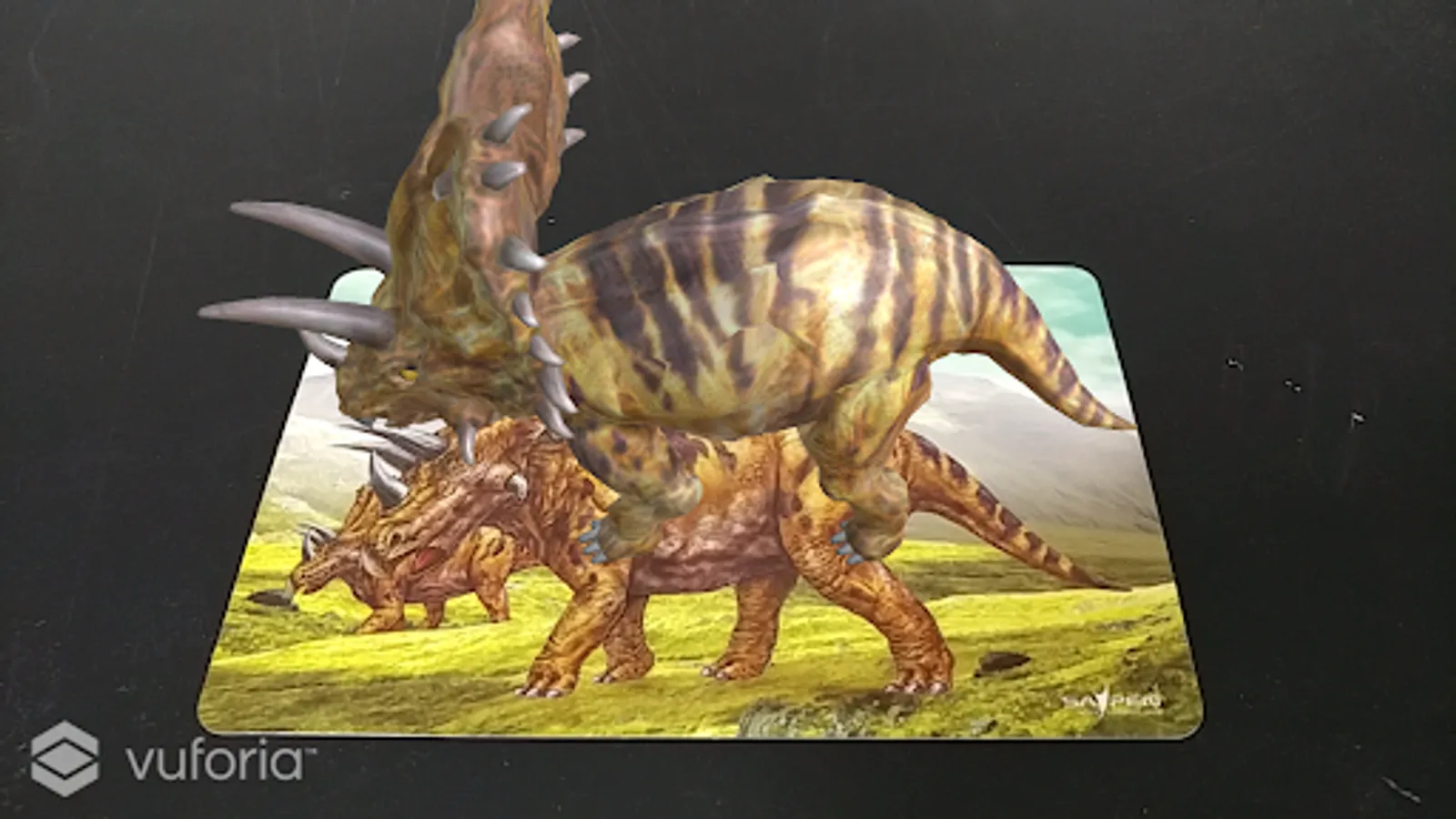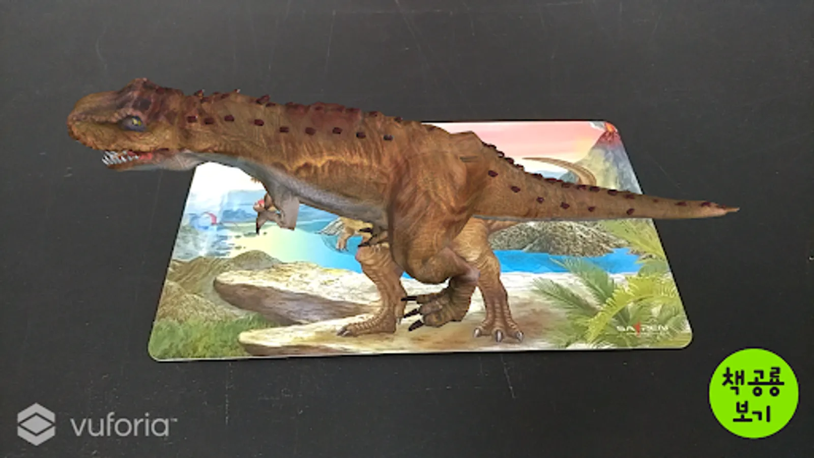 When a card or book is projected onto the rear camera of a smartphone or tablet, the image in the card appears on the screen as a 3D image of a dinosaur.