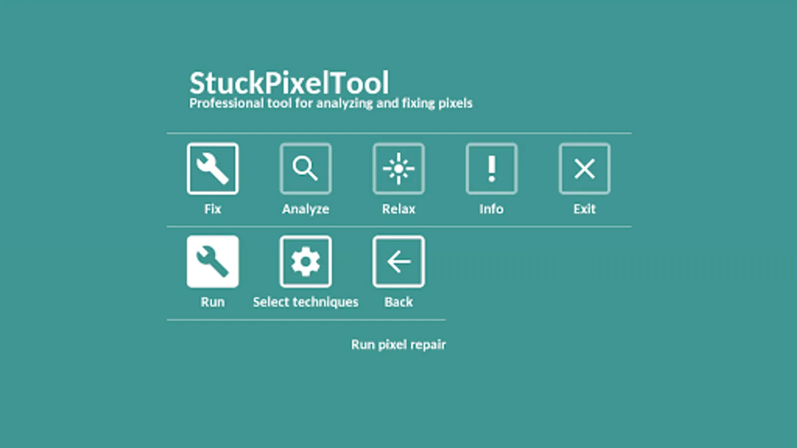 StuckPixelTool is easy to use app which is able to find and repair many kinds of display problems, such as stuck, defective or broken pixels (variations: stuck sub-pixels, dark dot defects, bright dot defects, partial sub-pixel defects, etc.), backlight bleed and screen burn-in (screen burnout, bad screen glow, image burnin or ghost image (screen ghosting), colloquially known as screen burn.