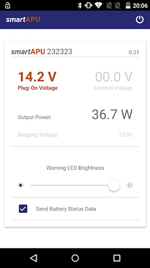 If the app has established a Bluetooth connection to your smartAPU™ device a check box will appear on the lower main screen within the app, called "Send Battery Status Data".