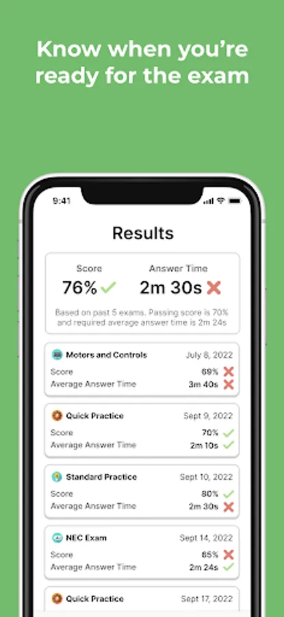 See how you do on the actual NEC Exam by simulating it on the app. We design the curriculum based on your State. For example, if you’re doing the California exam, we provide you 100 questions, distributed & weighed similarly to exam, and allocate 4.5 hours for completion. You’ll be able to see what sections you did well on, sections that need improvement, and your average answer time.